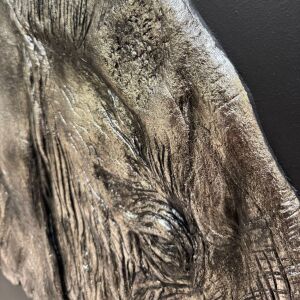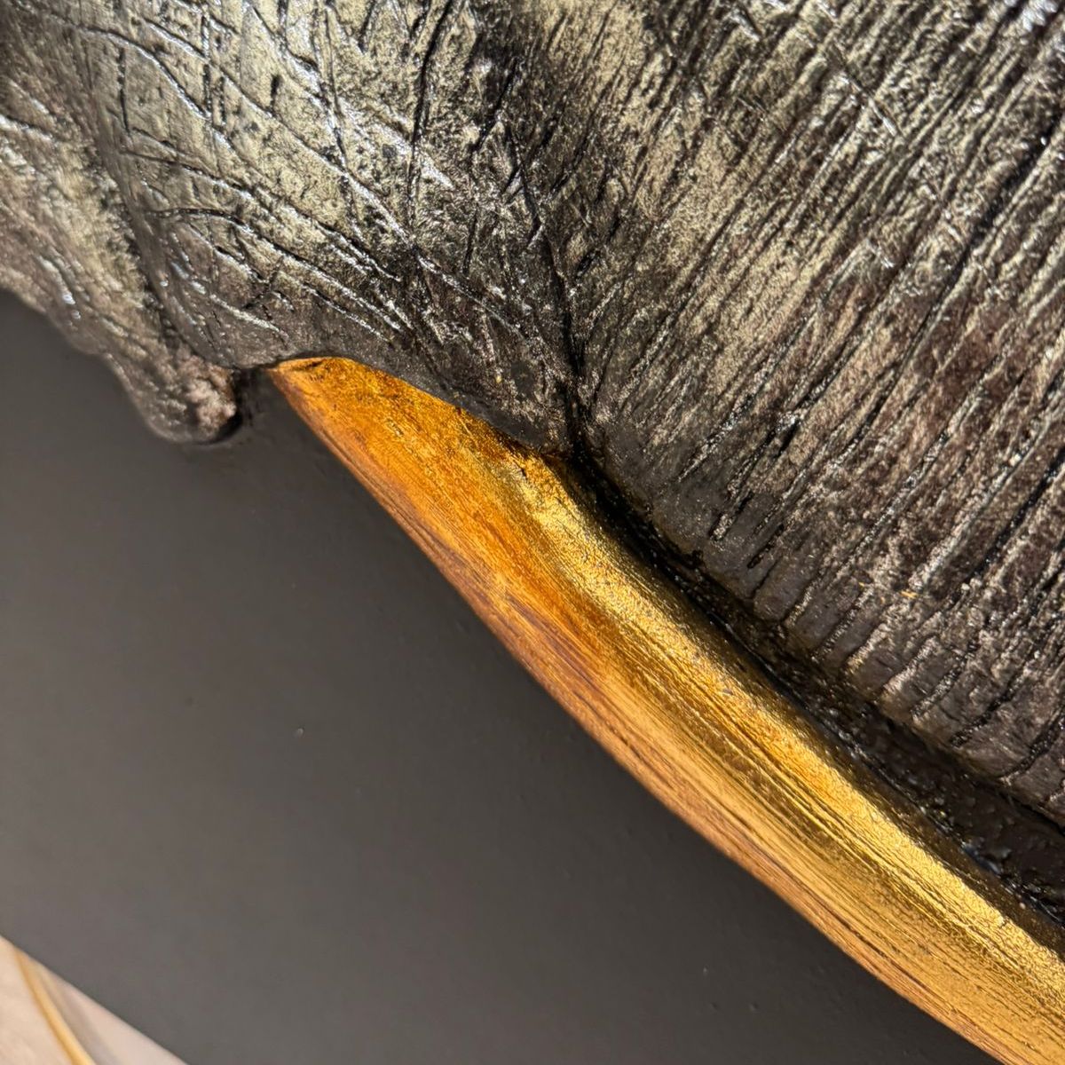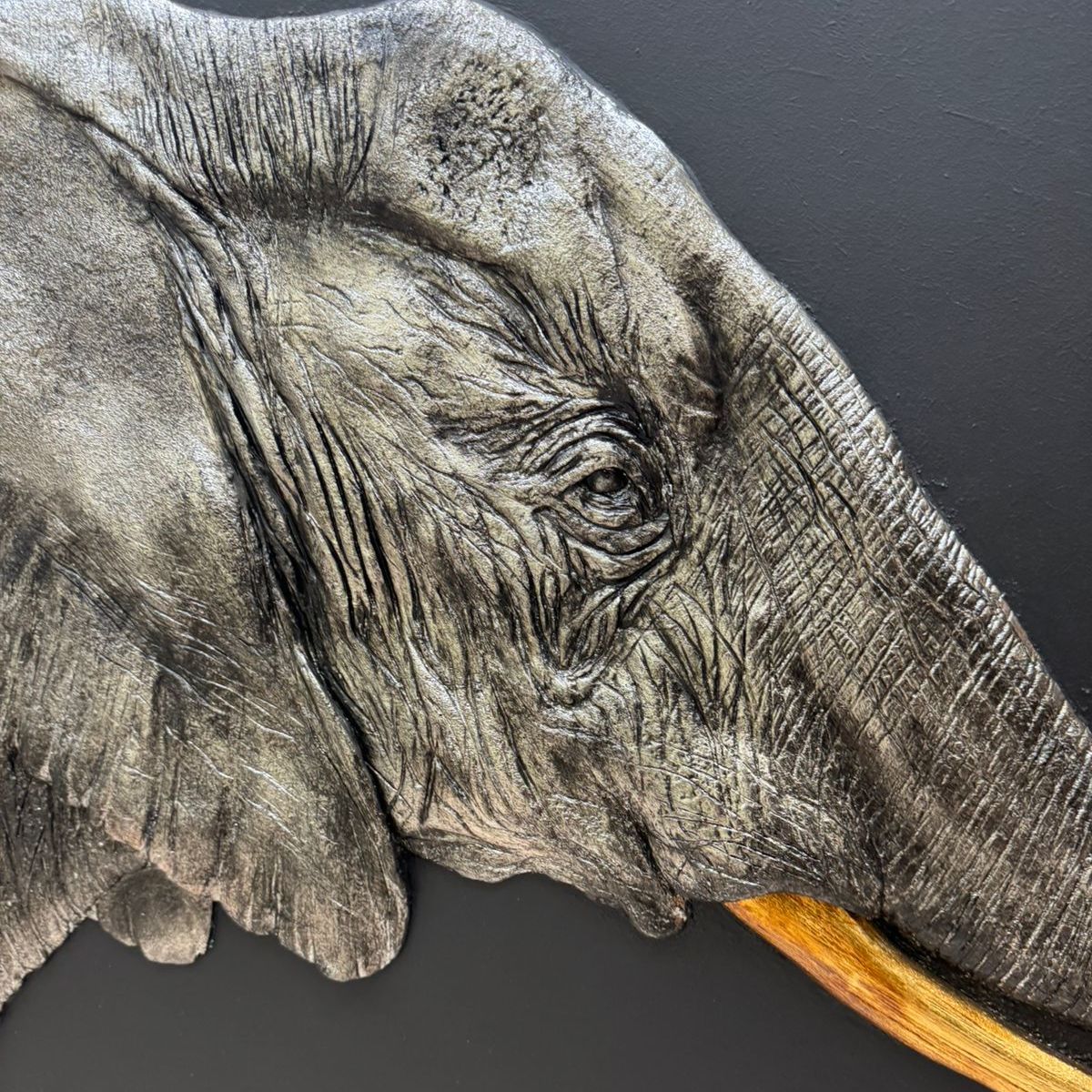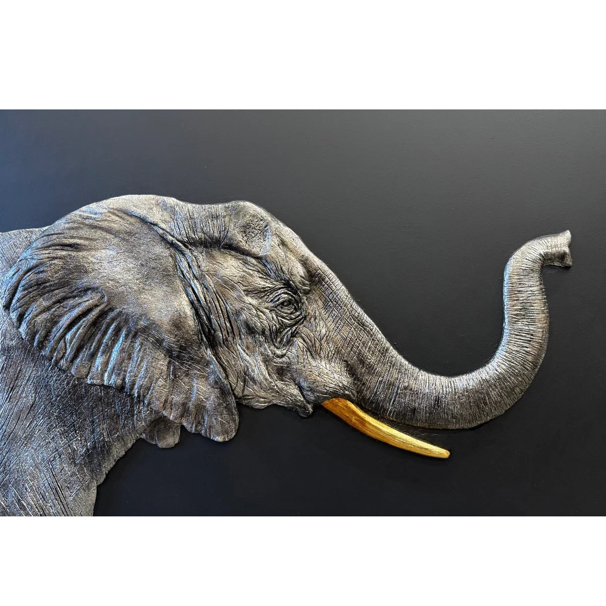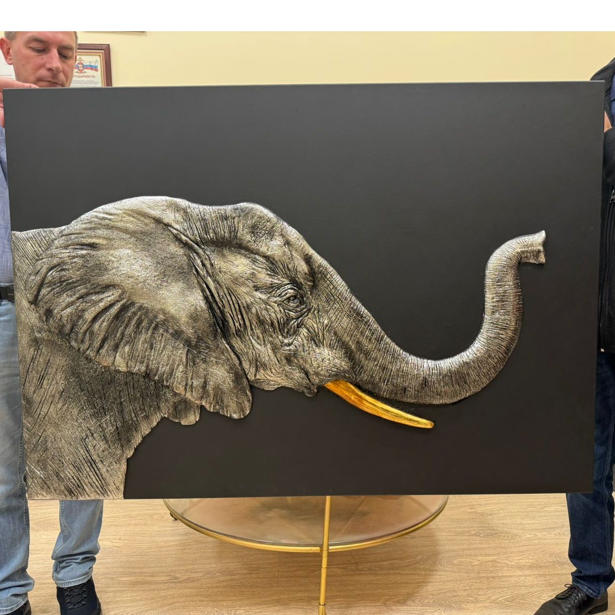 Основой композиции служит объёмный барельеф, выполненный с предельной тщательностью: каждая линия на коже словно прорезана временем, а изгиб хобота придаёт работе динамику и внутреннюю энергетику. Акцент в виде золотистой детали на бивне, нанесённый поталью тёплого оттенка, добавляет художественный баланс и оттеняет благородство серебра. Такое сочетание металлов создаёт игру света: панно меняет настроение в зависимости от освещения, проявляя то мягкое свечение, то глубокие тени.