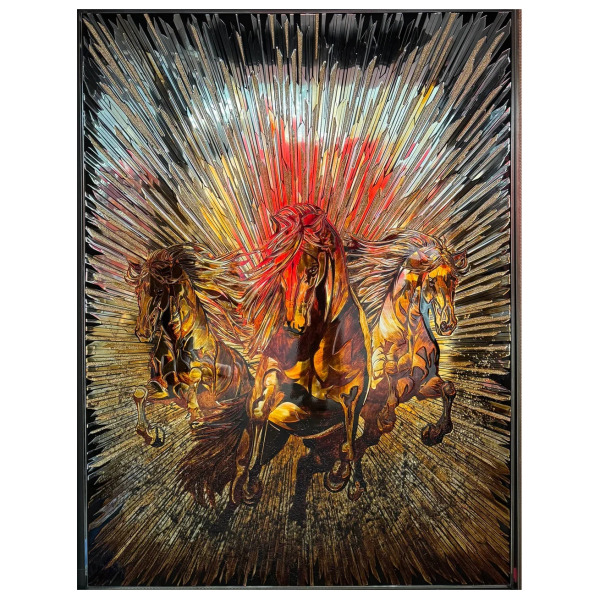 Три лошади, вырвавшиеся навстречу ветру, словно несут энергию первозданного потока, где каждый мазок передаёт пульс жизни. Яркие всполохи красного и золотого оттенков создают ощущение огня и стремительного полёта, а лучи, расходящиеся от центра, превращают композицию в символ торжества духа и победы.