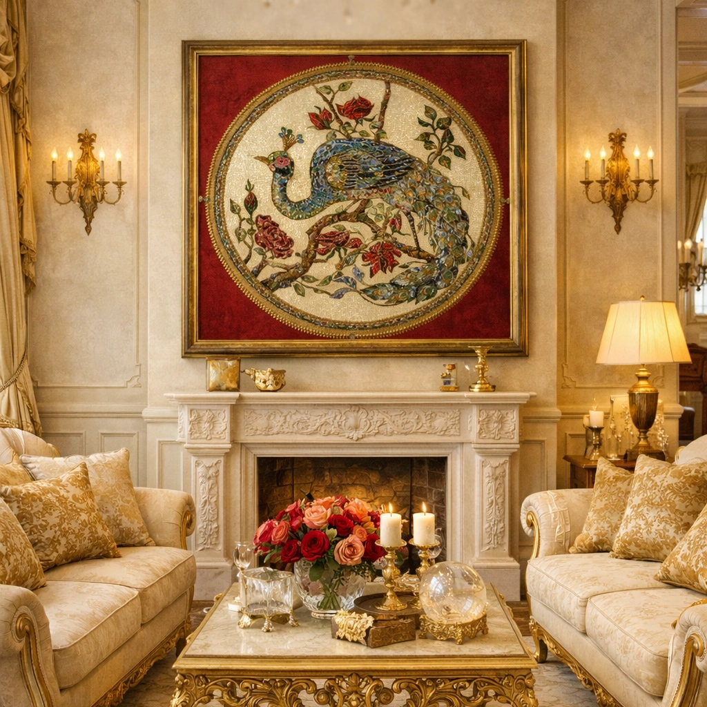 Панно «Павлин» — это не просто украшение интерьера, это история о величии и бессмертии, воплощенная в драгоценностях и мастерской вышивке. Оно станет символом статуса и внутреннего света своего владельца, отражая его стремление к идеалу и высшей гармонии.