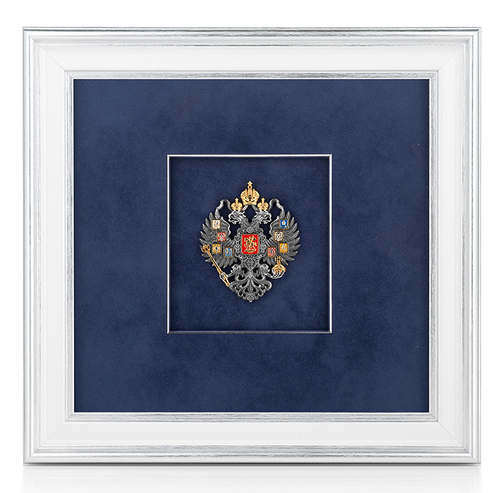 Герб Российской Империи выполнен вручную из серебра, с позолотой и эмалями. Государственный символ утоплен в багетную рамку настенного панно, с креплением на обратной стороне. Фирменный подарочный чехол в комплекте.
