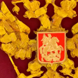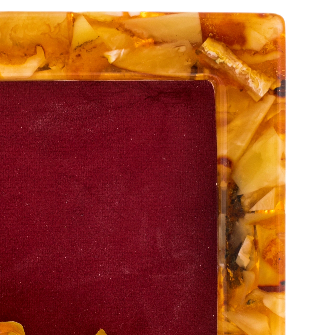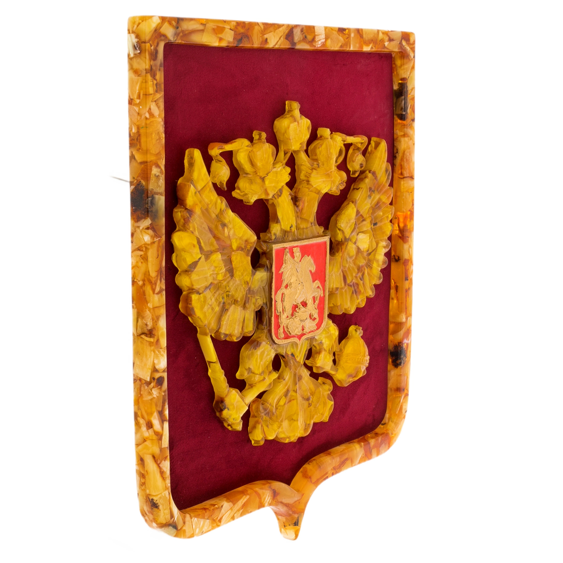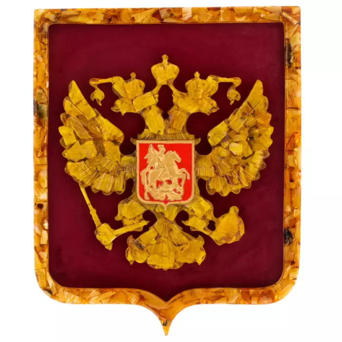 Янтарное панно «Герб России» представляет собой выразительное произведение декоративного искусства, в котором символ государственной власти раскрыт через природную красоту и глубину материала. Композиция построена вокруг двуглавого орла — традиционного знака российской государственности, выполненного в объёме и наполненного светом янтаря, благодаря чему образ приобретает особую теплоту и живую энергетику. Панно заключено в рамку, также сформированную из янтарных элементов, а фон насыщенного бордового оттенка усиливает контраст и подчёркивает центральную фигуру, делая её визуально доминирующей.