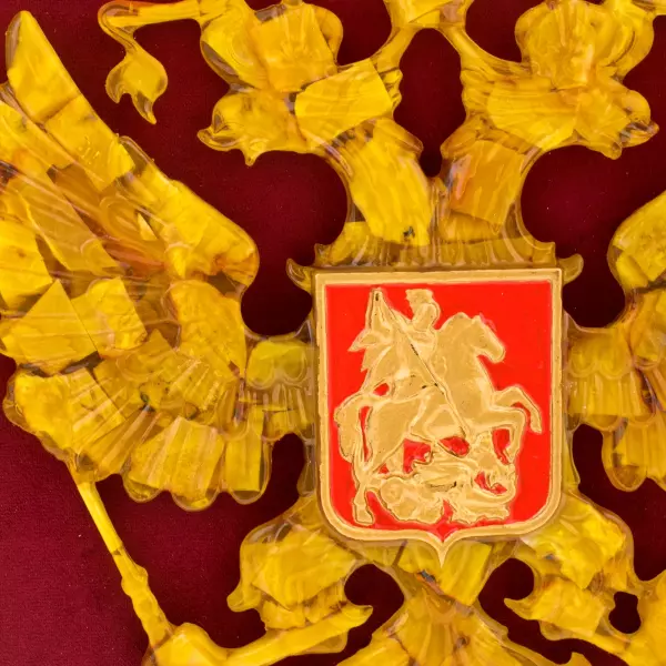 Художественное решение основано на использовании натурального янтаря, отличающегося богатой палитрой оттенков — от светло-медовых до глубоких коньячных тонов. Полупрозрачная структура материала позволяет свету проходить сквозь форму, создавая эффект внутреннего свечения, благодаря чему орёл выглядит не статичным изображением, а словно живым символом. Детали герба, включая щит с образом Георгия Победоносца, короны, скипетр и державу, проработаны с вниманием к пропорциям и традиционной иконографии, формируя цельную и гармоничную композицию.
