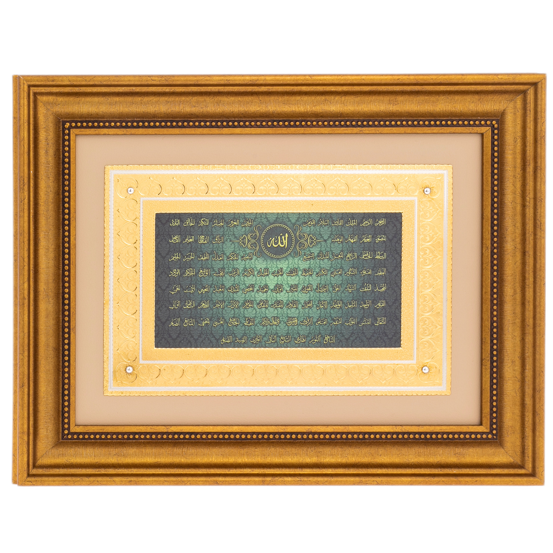 Панно «99 имён Аллаха» — изысканный декоративный объект, сочетающий в себе глубокое духовное содержание и безупречное художественное исполнение. В центре композиции — имя Аллаха, заключённое в орнаментальный медальон, от которого в строгом порядке расходятся 99 священных эпитетов, отражающих божественные качества. Арабская каллиграфия выведена золотом на тёмном фоне с переходом от глубокого зелёного к насыщенному бирюзовому, создающим ощущение глубины и света, исходящего изнутри. Панно заключено в элегантную раму с объёмным паспарту и акцентировано сиянием декоративных кристаллов по углам.