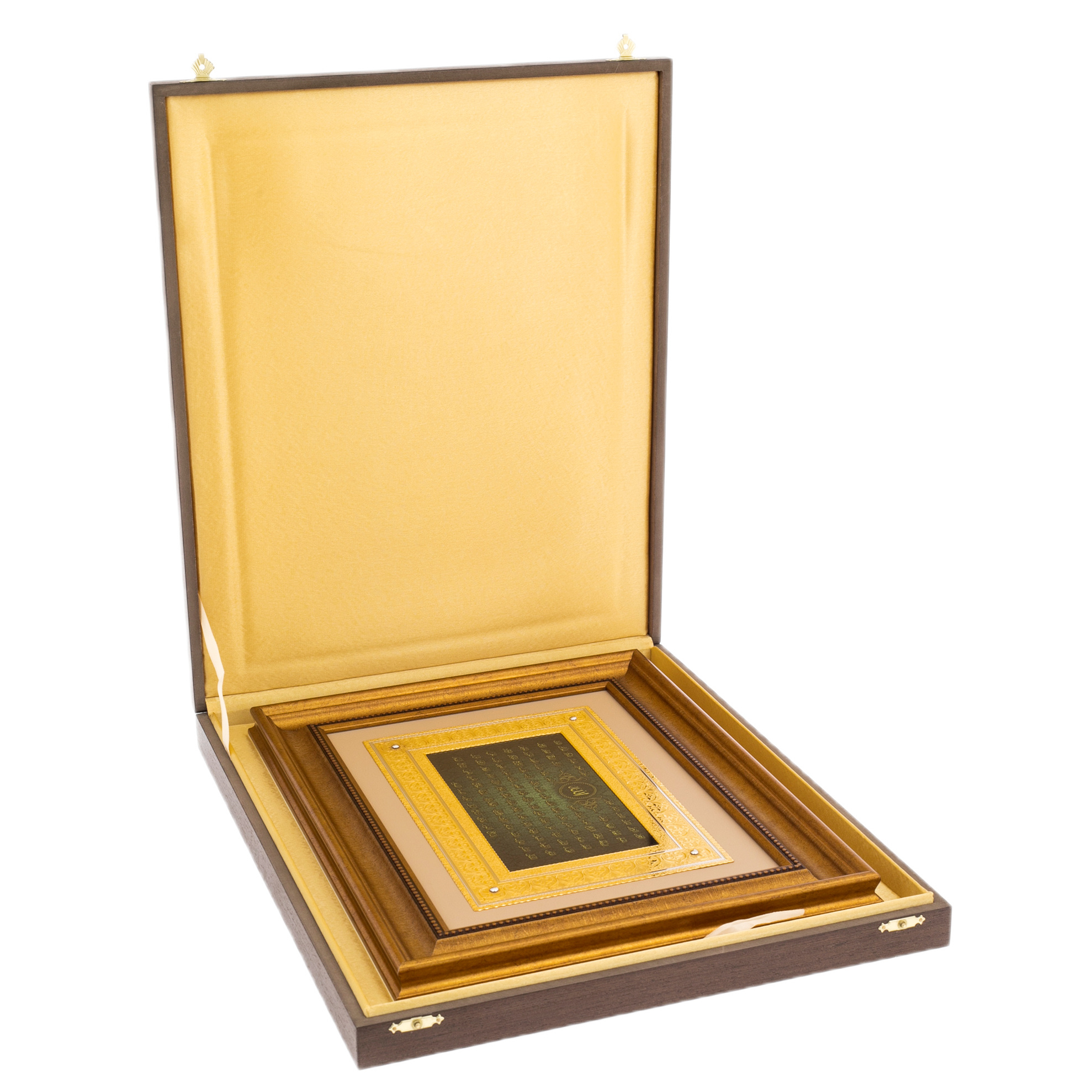 Мастера Златоуста использовали классическую технику гравюры по металлу с последующим золочением и чернением. Каждое имя прорисовано вручную, с филигранной точностью и уважением к канонам исламской каллиграфии. Металлическая пластина прошла многоступенчатую обработку: от механического травления до гальванического нанесения золота и серебра. Цветной фон создан методом устойчивой художественной тонировки, подчёркивающей игру света и придающей изображению почти ювелирную выразительность.