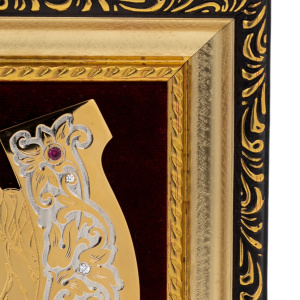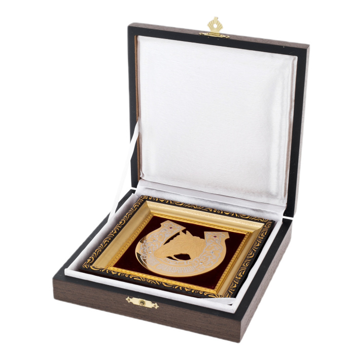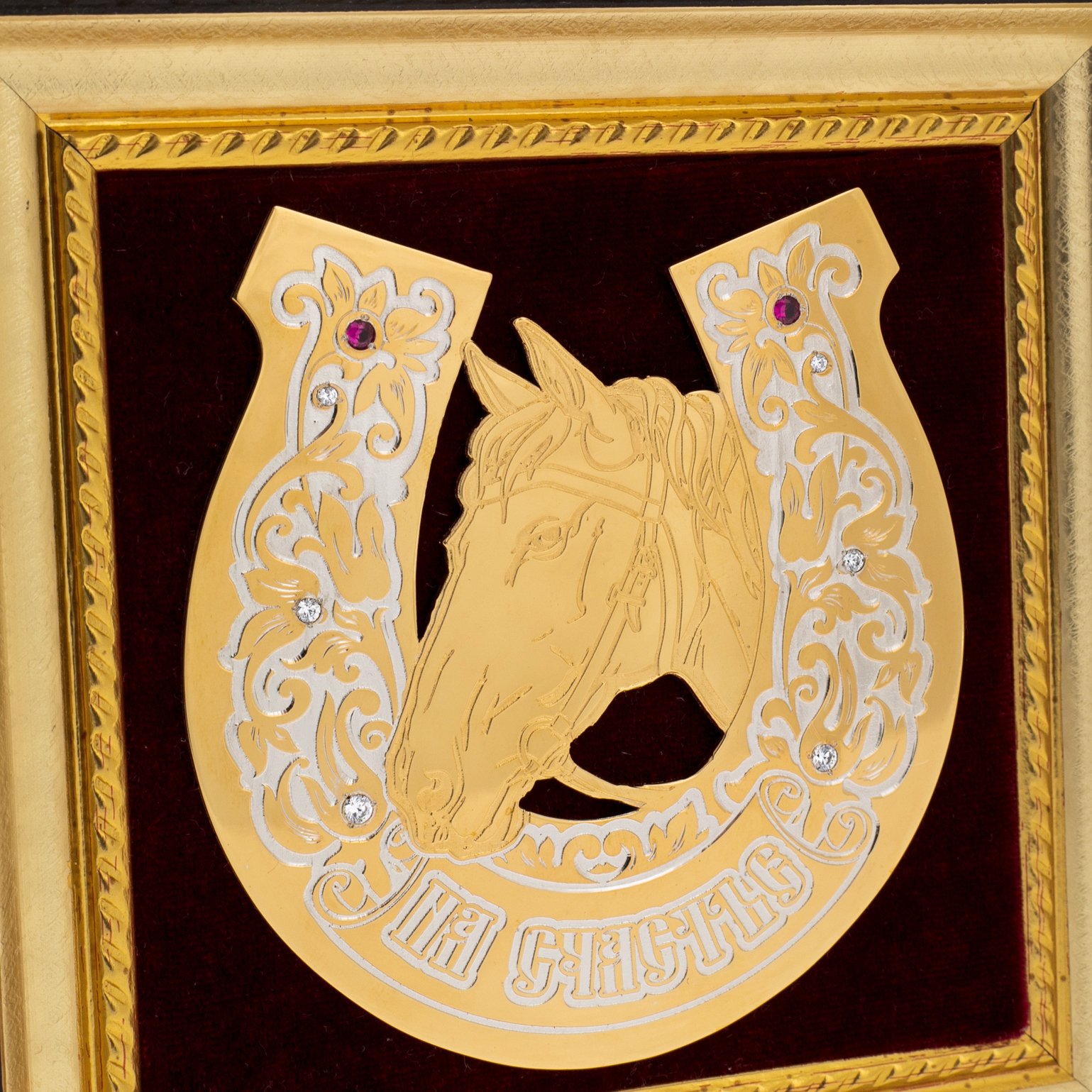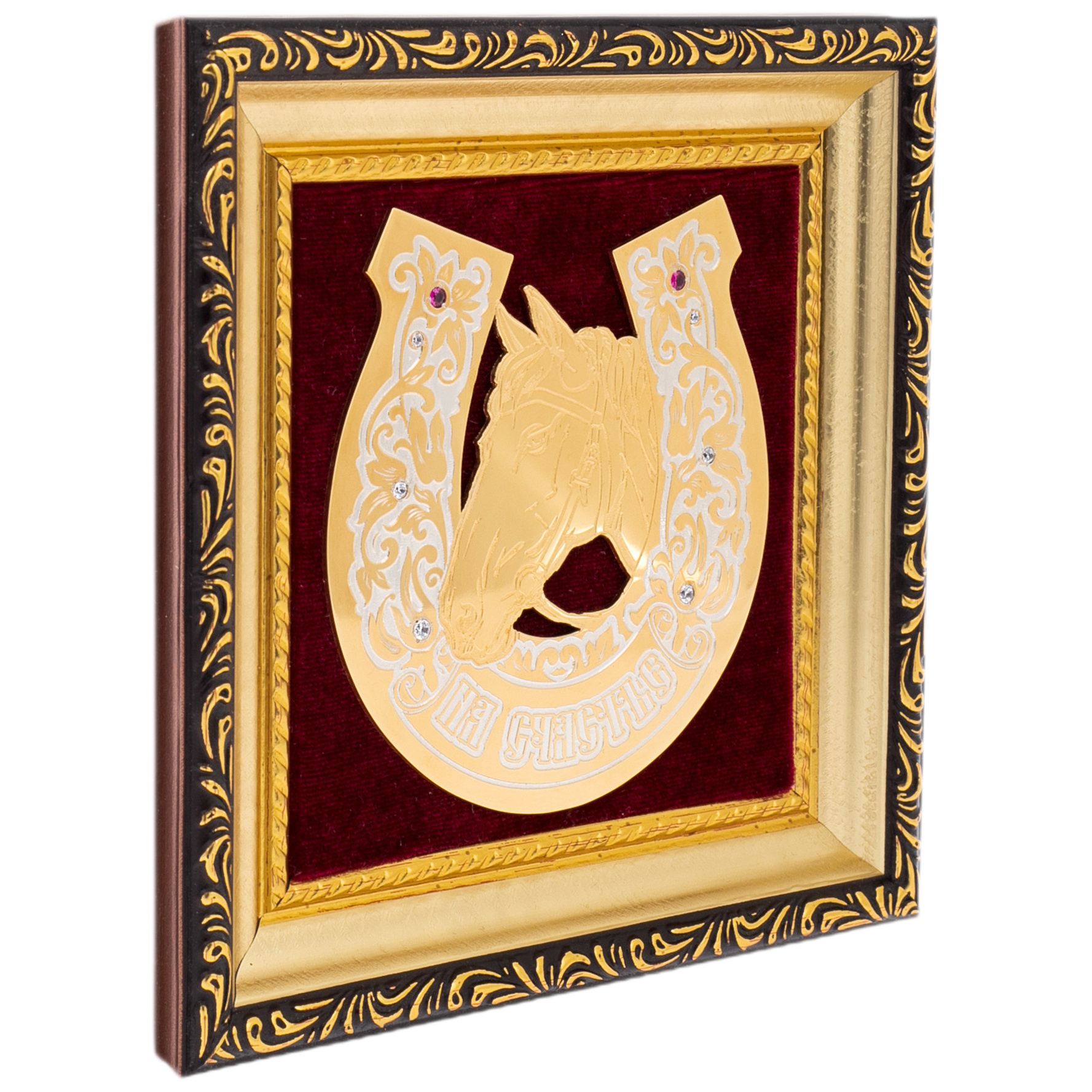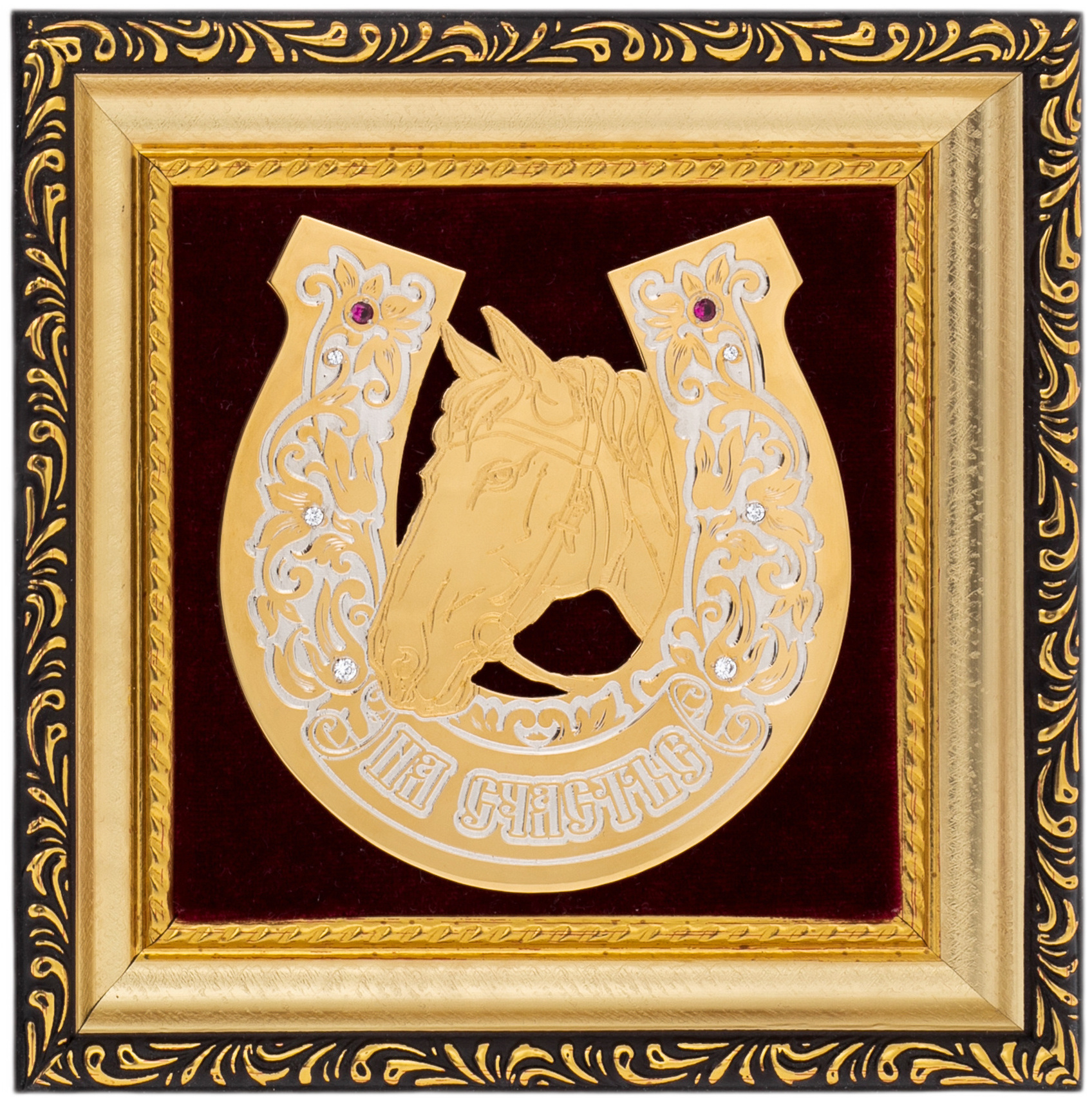 Панно «Лошадь с подковой» — символ удачи, силы и благородства, воплощённый в благородных металлах Златоуста. На бархатном фоне сияет подкова из латуни с золочением, украшенная тончайшей гравировкой и вставками из кристаллов. В её центре — изящный барельеф лошадиной головы, исполненный с ювелирной точностью и теплотой.