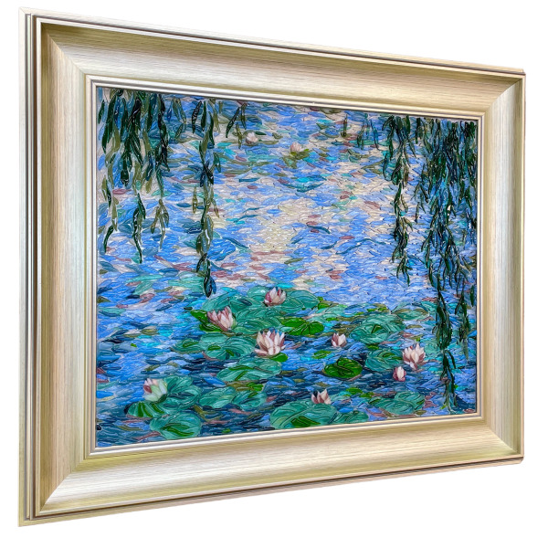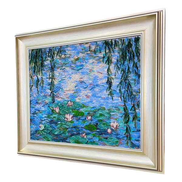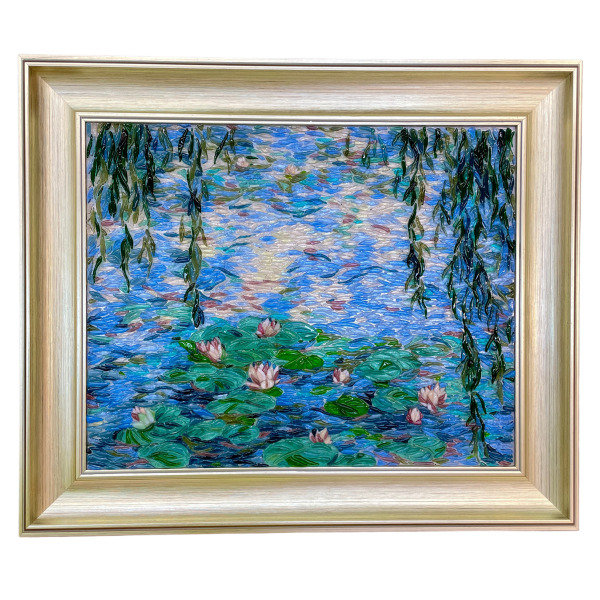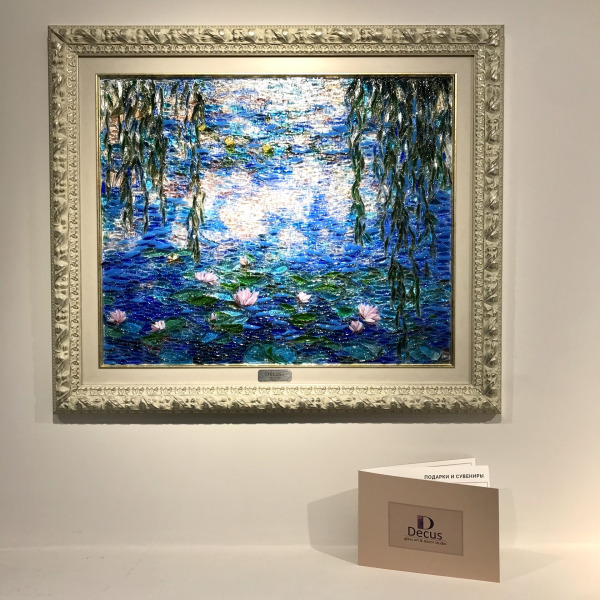 Панно является уникальным арт-объектом, созданным вручную по мотивам знаменитой картины Клода Моне "Пруд с водяными лилиями". Вдохновленное импрессионистским стилем художника, это произведение искусства передает атмосферу спокойствия и гармонии, присущую водным ландшафтам.