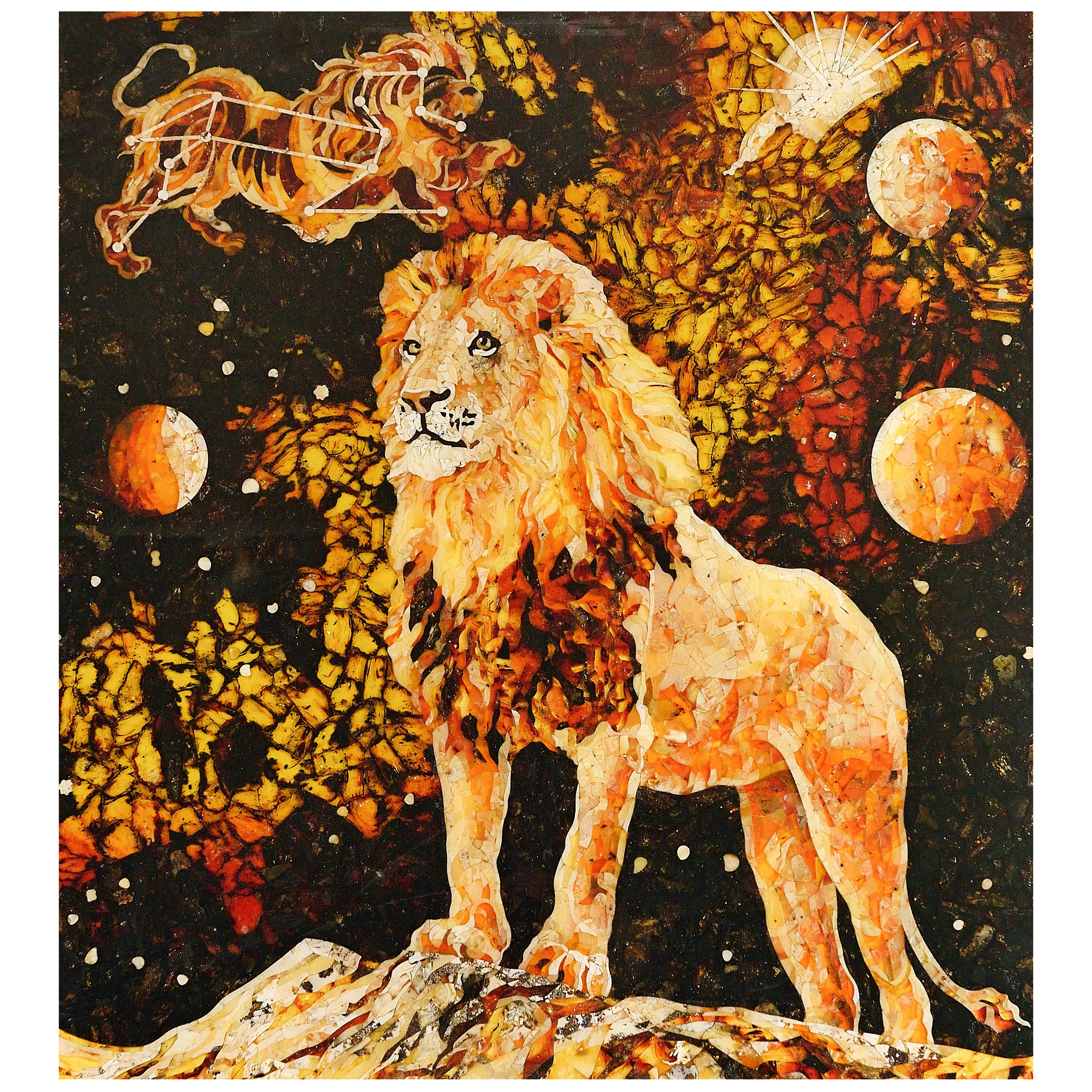 Застывший во времени момент торжества и могущества, где вечность сплетается с природной силой льва, символа власти и лидерства. Это панно из янтаря воплощает в себе весь спектр космических энергий, подчеркивая величие Зодиака. Лев, возвышающийся на фоне галактической вселенной, будто проникает за пределы обычного восприятия, унося своего владельца в мир бесконечных возможностей.