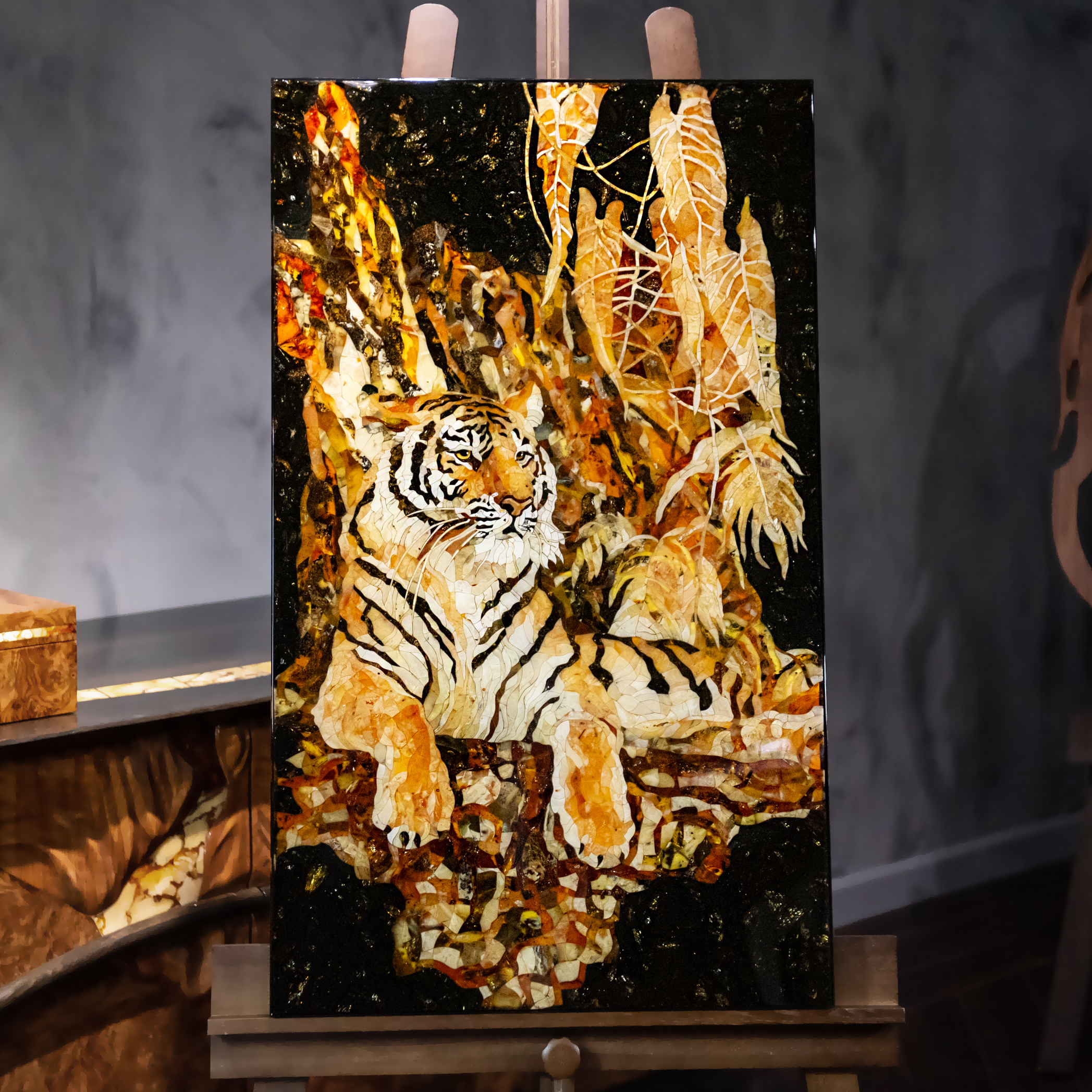 Каждая линия панно, выполненная из янтаря, словно живет своей жизнью, следуя за изгибами тигриных полос и завораживая игрой светотени. Взгляд тигра — это вызов, это символ неукротимой мощи и лидерства, который напоминает о том, что истинная власть не требует лишних слов. Тигр лежит в полной уверенности и спокойствии, зная, что все под его контролем — этот образ станет отражением характера человека, выбирающего для себя такой предмет искусства.