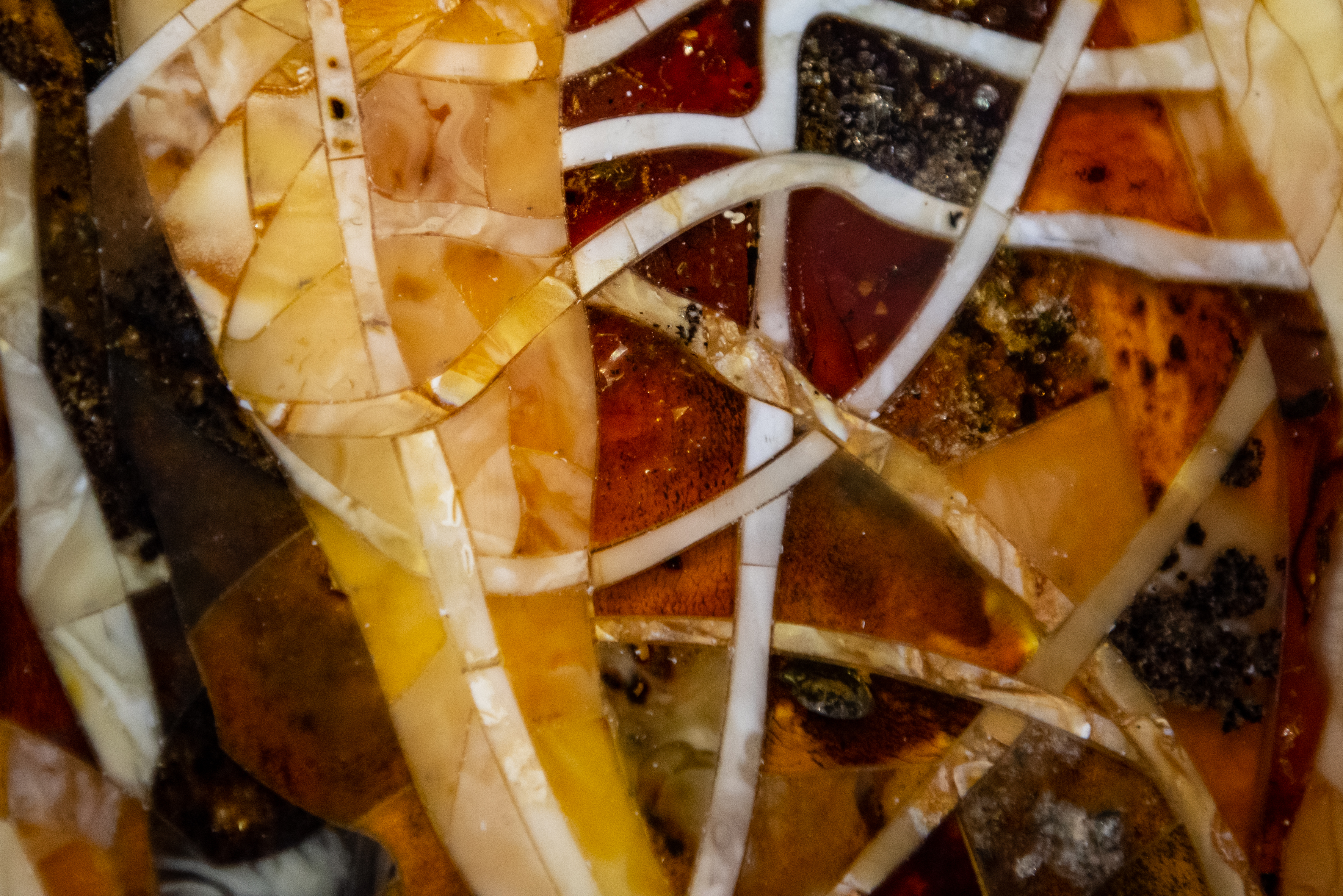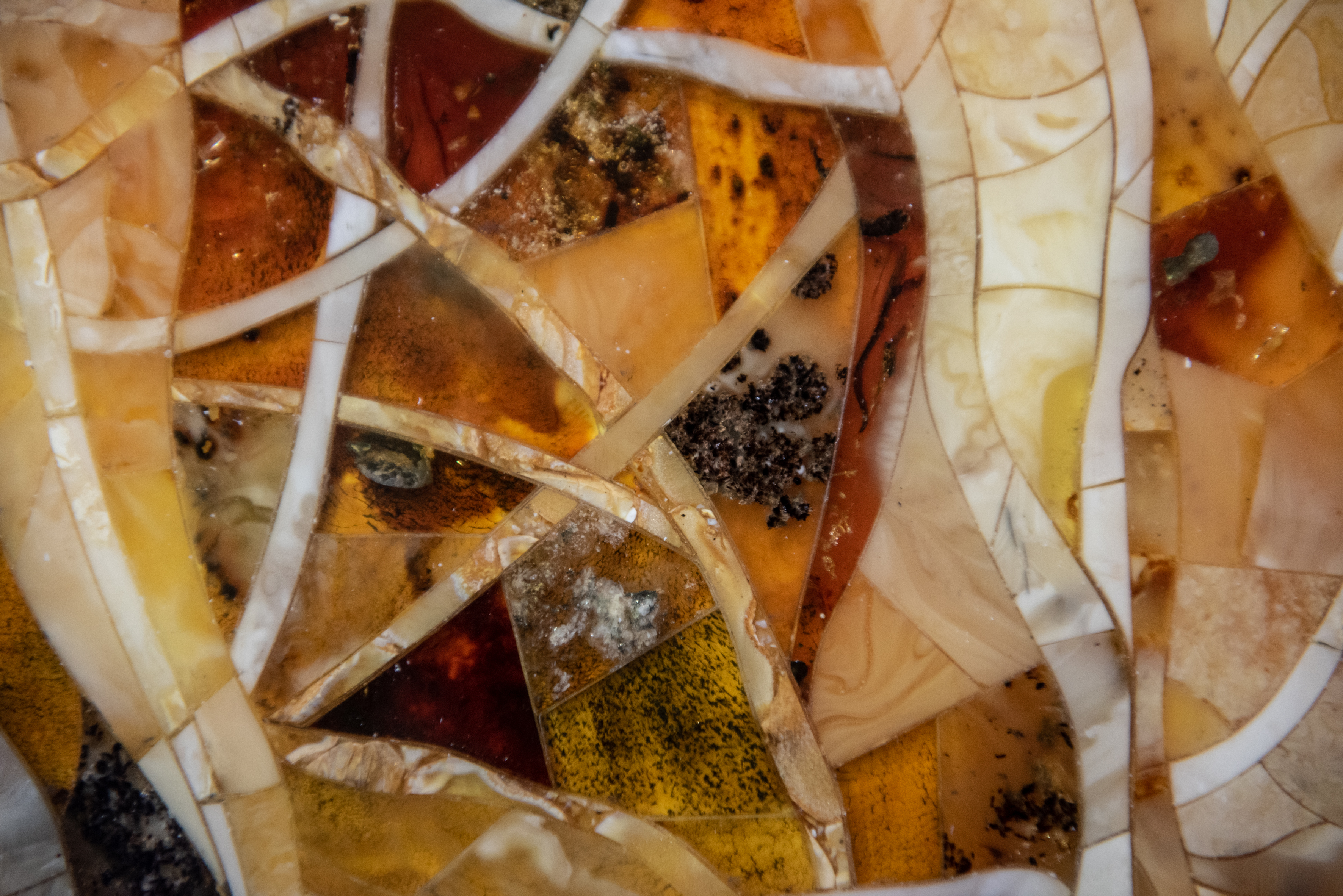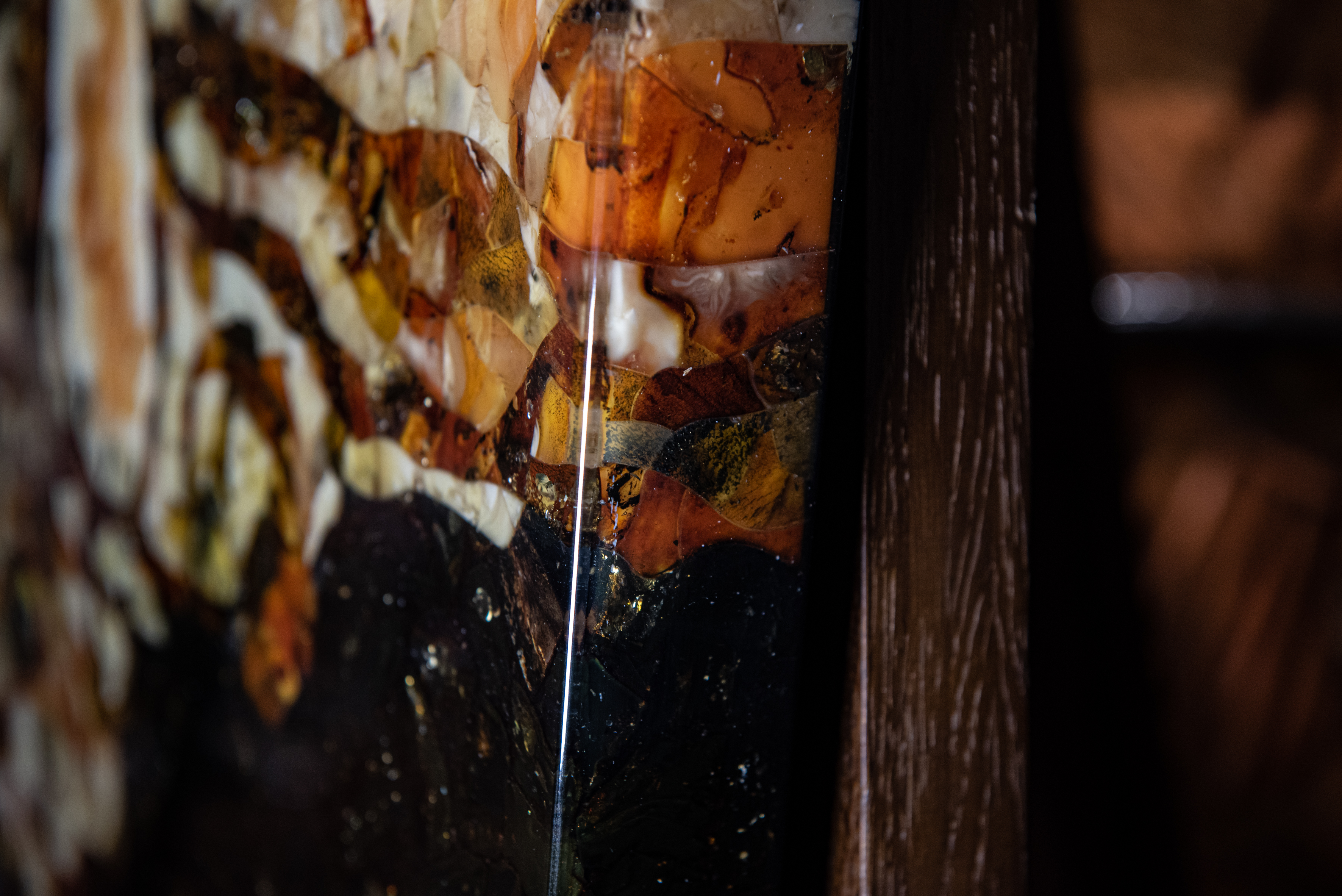 Янтарь, использованный в панно, вбирает в себя не только игру света, но и весь спектр эмоций, от теплоты до мощной, глубокой силы. Черные и золотистые оттенки создают впечатление постоянного движения, будто тигр готов в любой момент встать и подчинить себе окружающий мир.