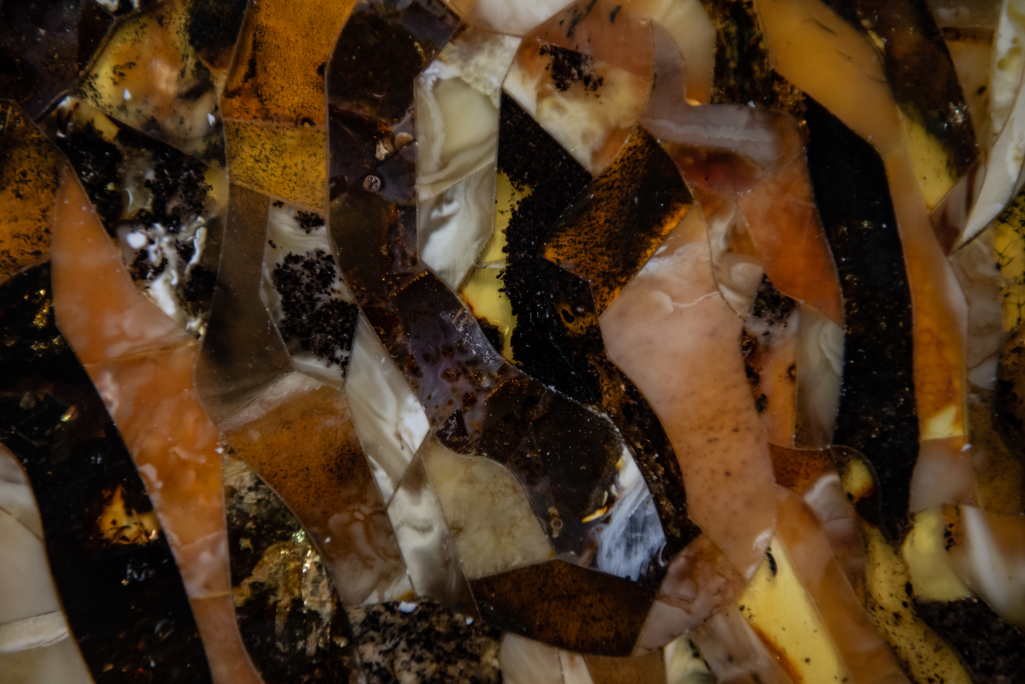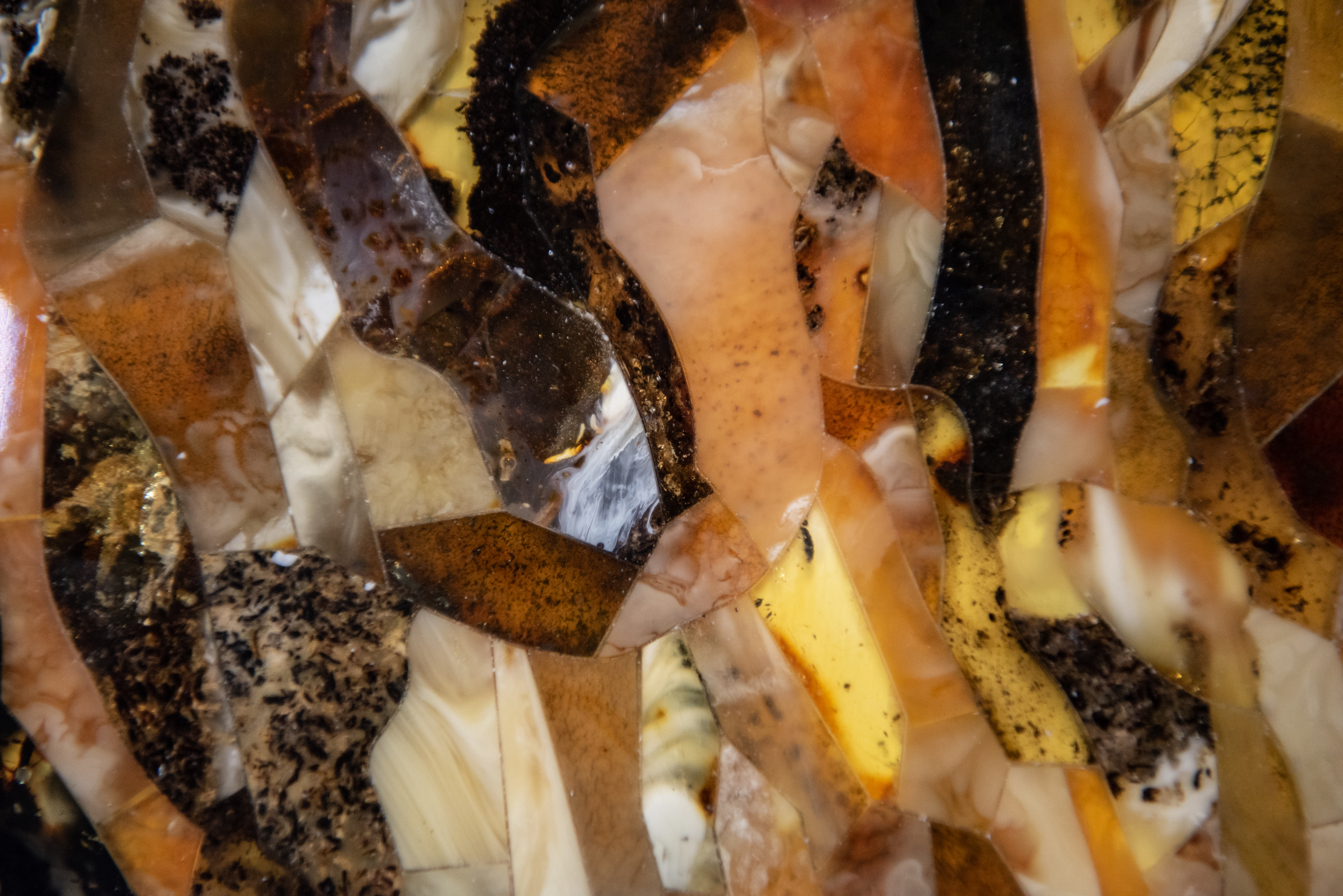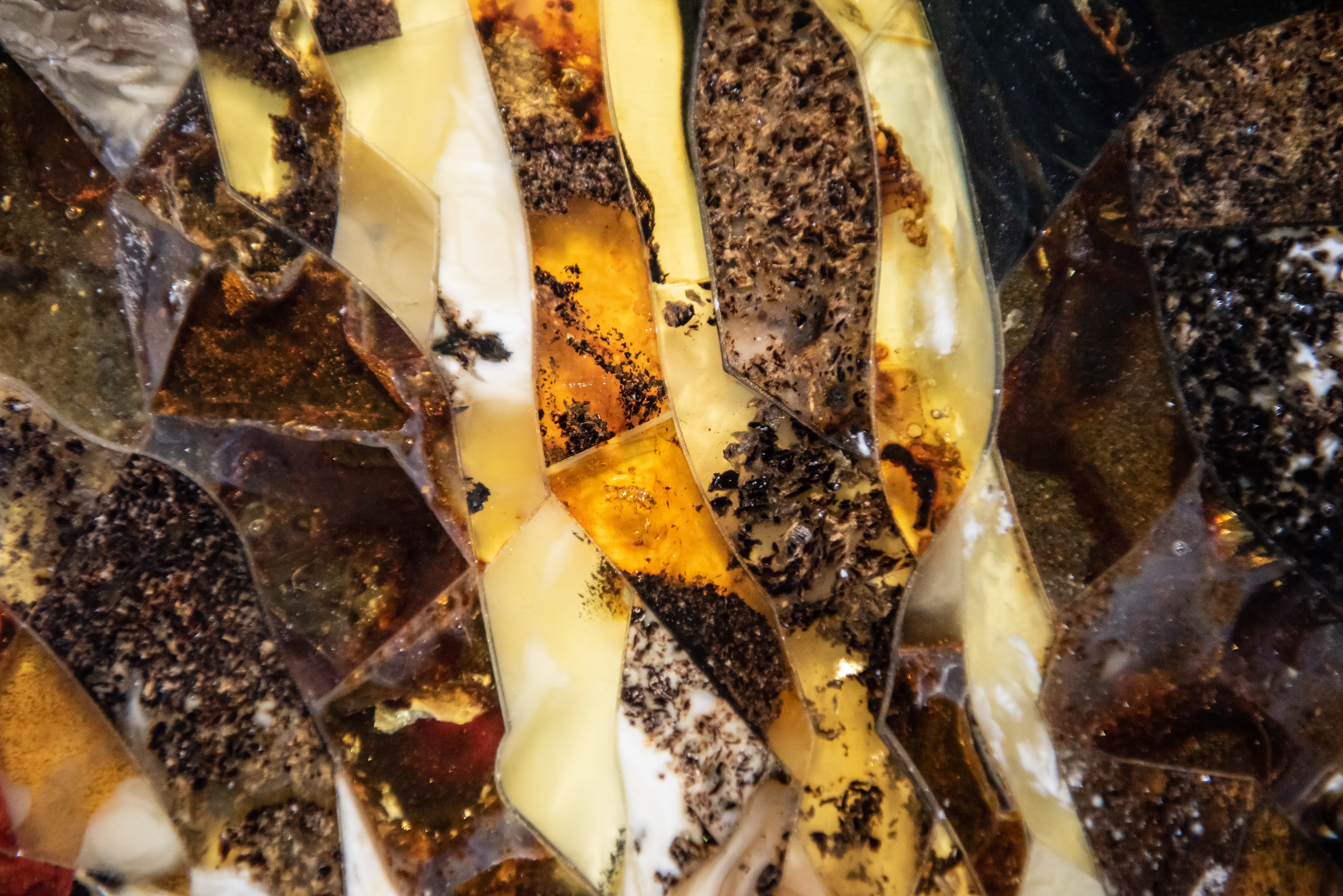 Янтарь, использованный в панно, вбирает в себя не только игру света, но и весь спектр эмоций, от теплоты до мощной, глубокой силы. Черные и золотистые оттенки создают впечатление постоянного движения, будто тигр готов в любой момент встать и подчинить себе окружающий мир.