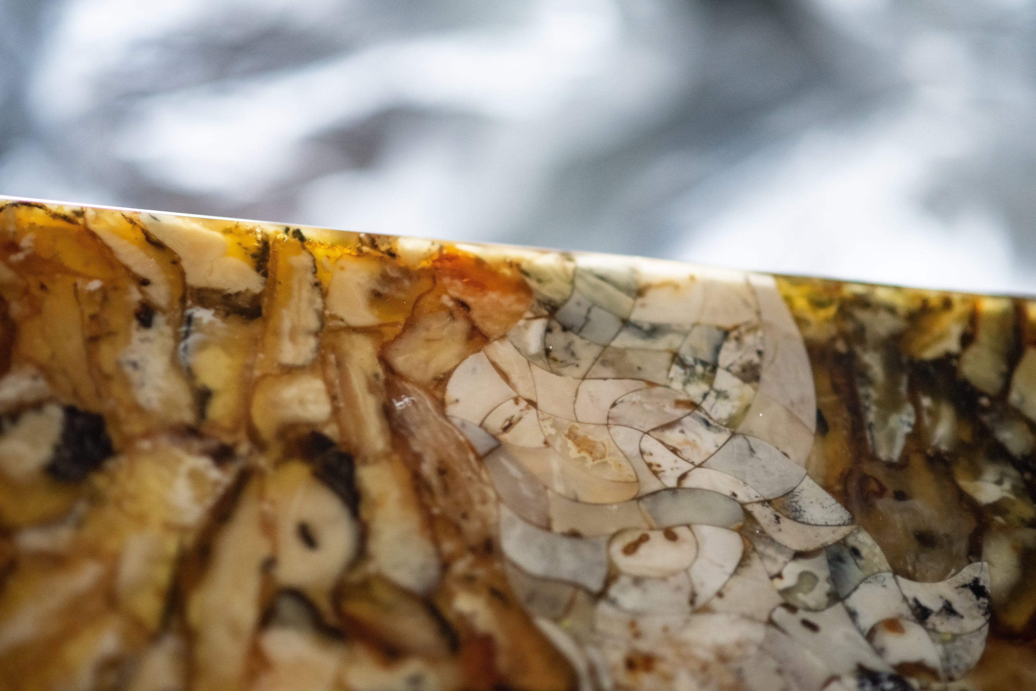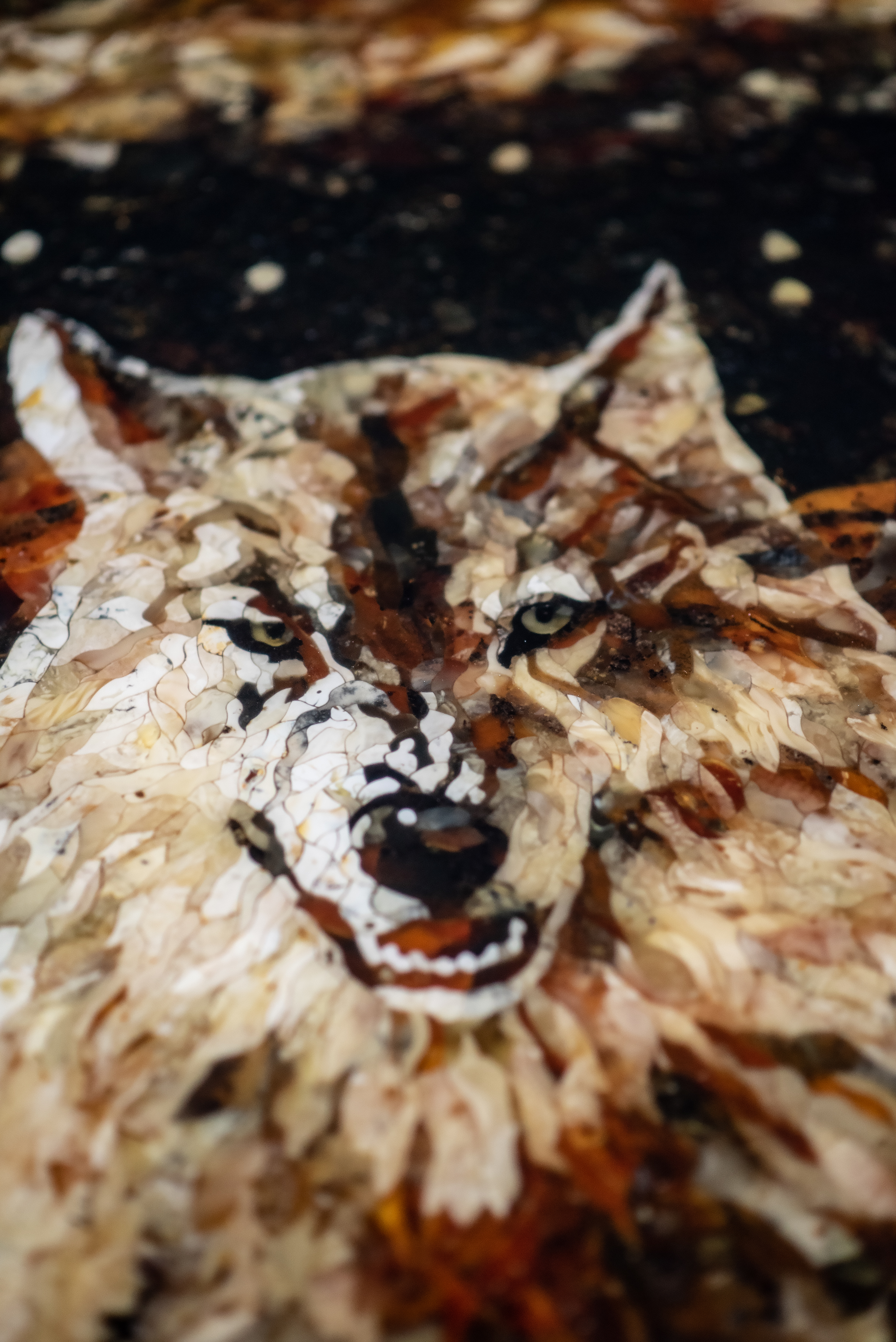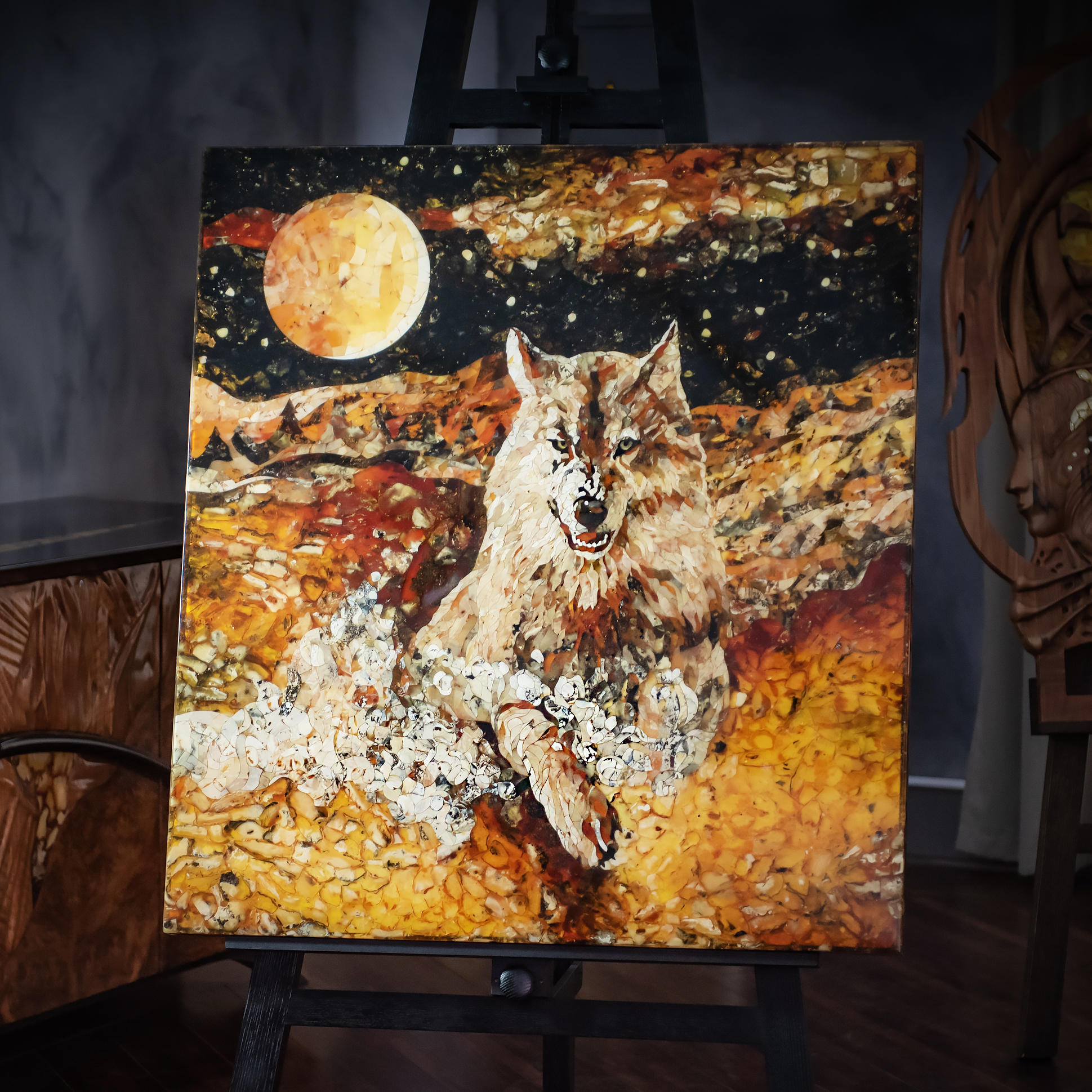 Тонкие янтарные линии и переливы оттенков создают эффект живого движения, как будто волк вот-вот прыгнет, готовый броситься вперед. Каждый кусочек янтаря передает многослойность и глубину его шерсти, подчеркивая динамизм и красоту животного мира. В этом панно заключено не только мастерство создания уникального предмета интерьера, но и философия независимости и силы характера.