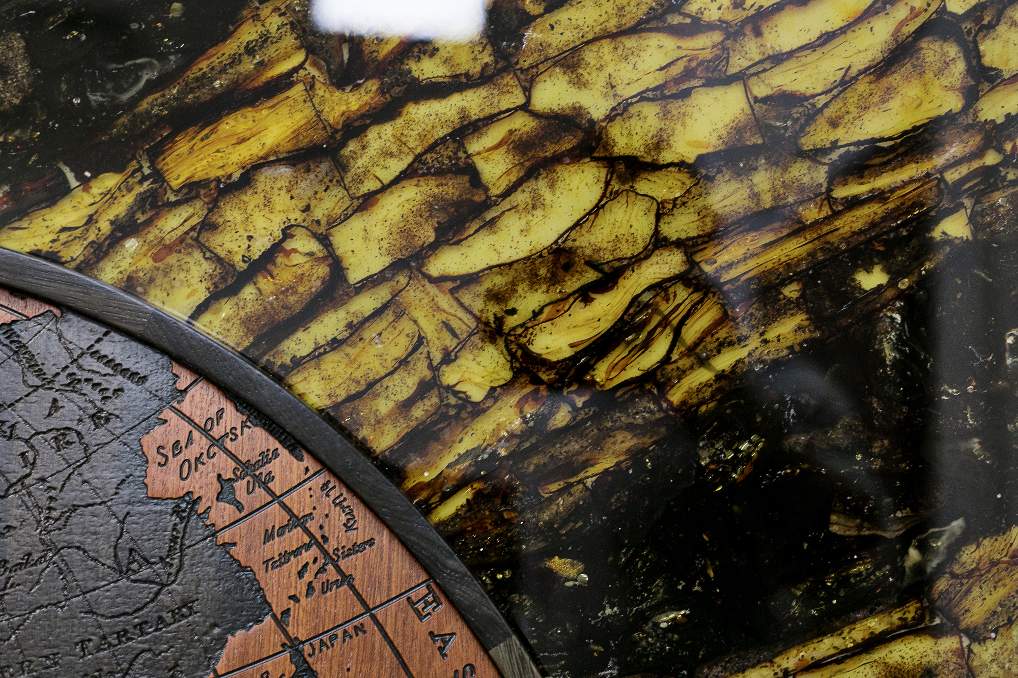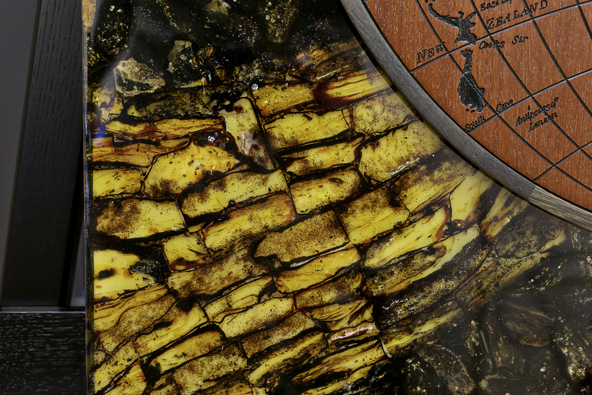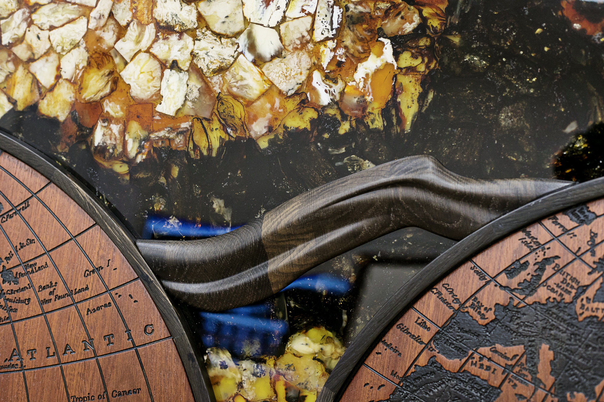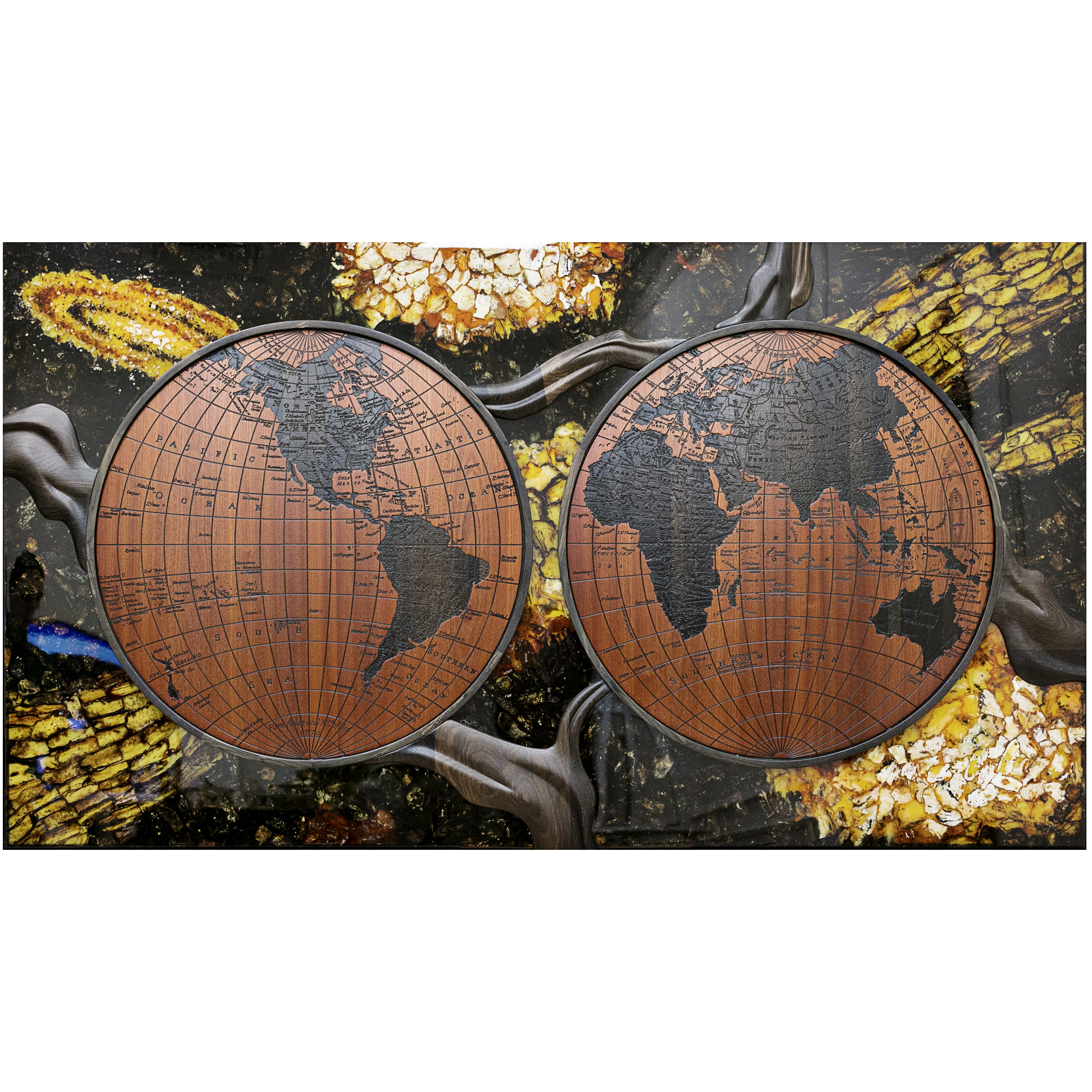Деревянная основа, выполненная из редких пород, придает композиции структуру, а сложные рельефы картины напоминают очертания галактик, пульсирующих в ритме космоса. Планетарные карты на панно, аккуратно вырезанные и инкрустированные янтарем, создают впечатление, что вы держите в руках не только историю Земли, но и карту бесконечных миров, раскинувшихся за пределами видимого. Тонкие переходы цветов и материалов словно переносят вас в другое измерение, где каждая деталь наполнена смыслом.