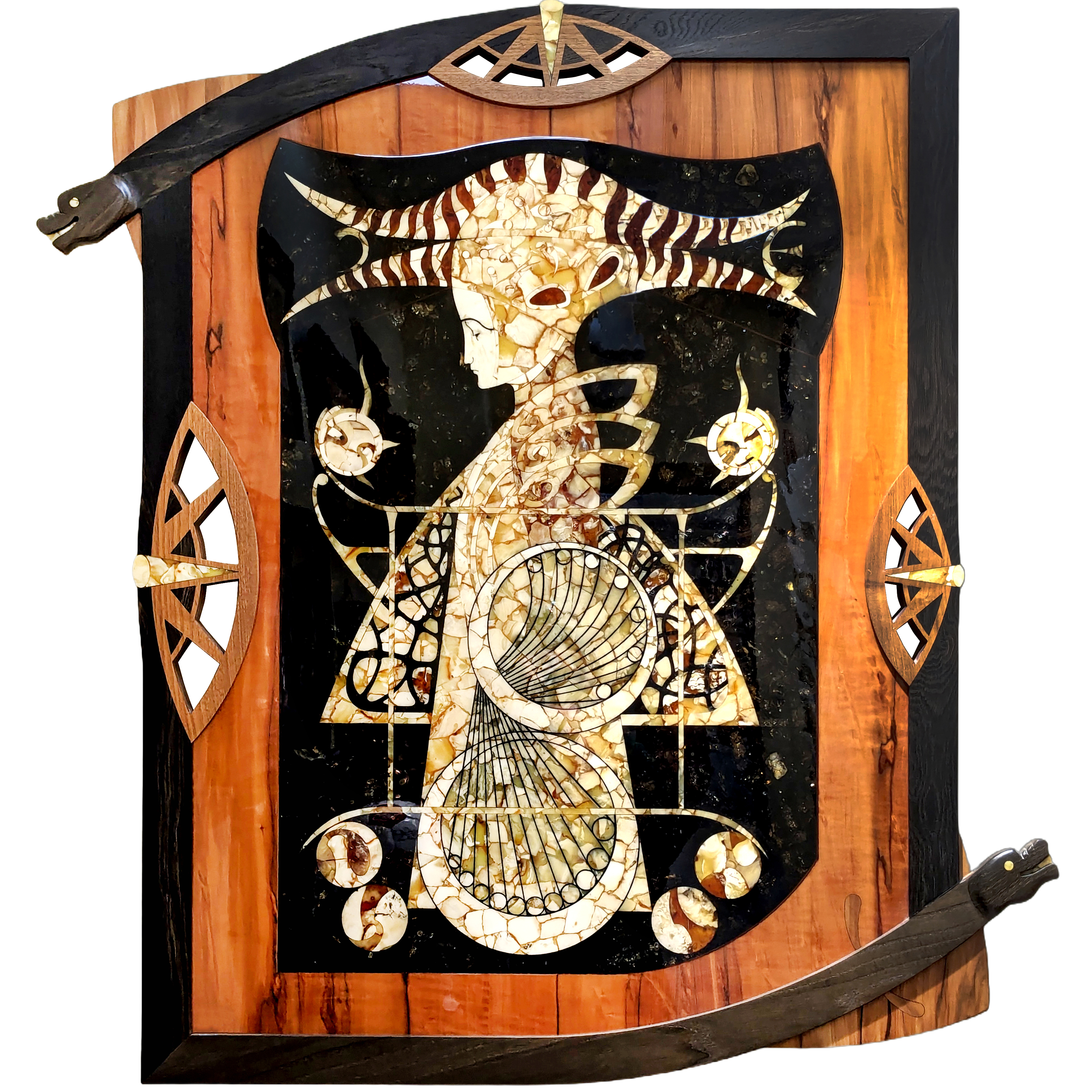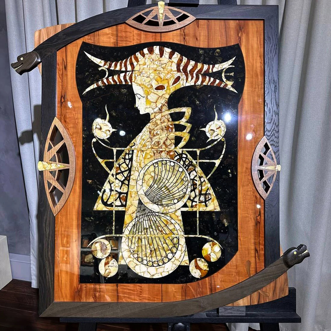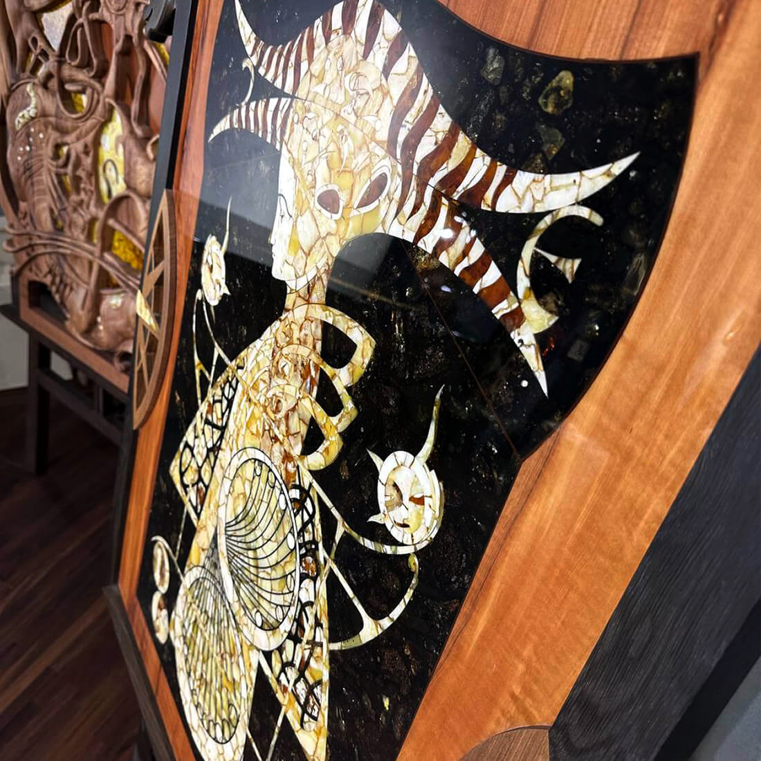 Панно представляет собой абстрактную композицию, на которой древесные волокна танцуют в сложном плетении с яркими янтарными вкраплениями, напоминая древние руны и таинственные символы. Картина изготовлена с непревзойденным мастерством, каждый фрагмент янтаря в ней плавно переходит в другой, создавая гармоничный и завораживающий образ.