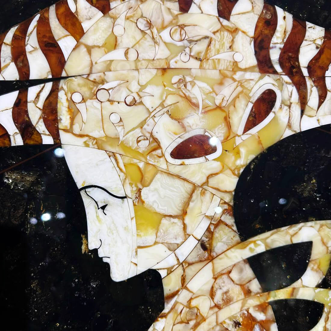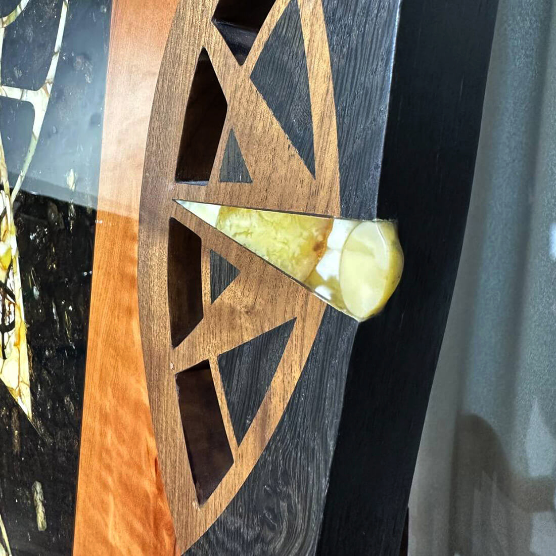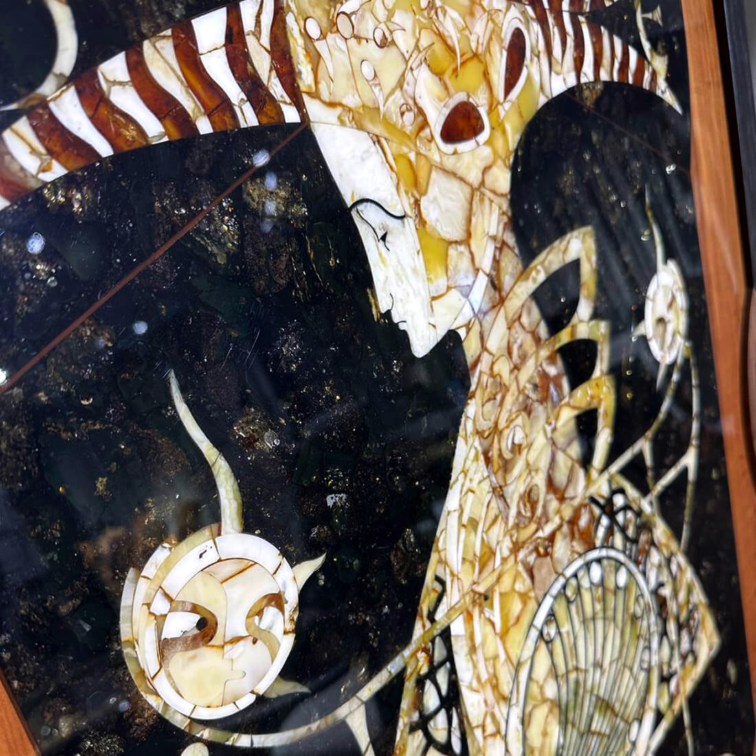 Панно представляет собой абстрактную композицию, на которой древесные волокна танцуют в сложном плетении с яркими янтарными вкраплениями, напоминая древние руны и таинственные символы. Картина изготовлена с непревзойденным мастерством, каждый фрагмент янтаря в ней плавно переходит в другой, создавая гармоничный и завораживающий образ.