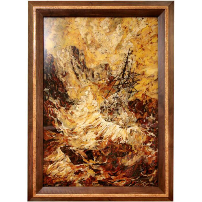 В центре этого буйного морского полотна — корабль, раздираемый стихией. Он становится образом наших жизненных испытаний, того внутреннего шторма, с которым мы сталкиваемся на пути к цели. Янтарь здесь олицетворяет силу духа и теплоту надежды, которые никогда не угасают даже в самые темные моменты.