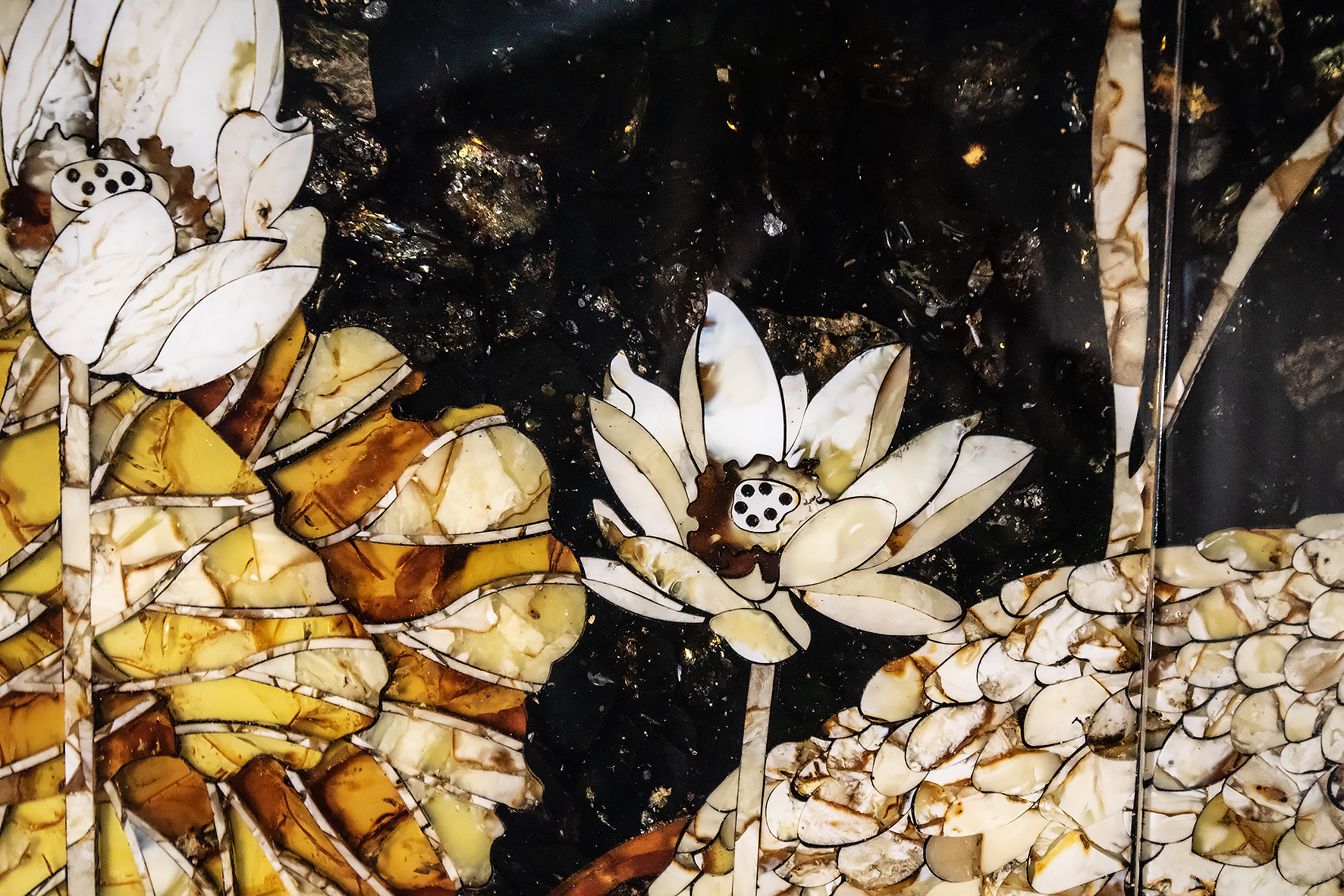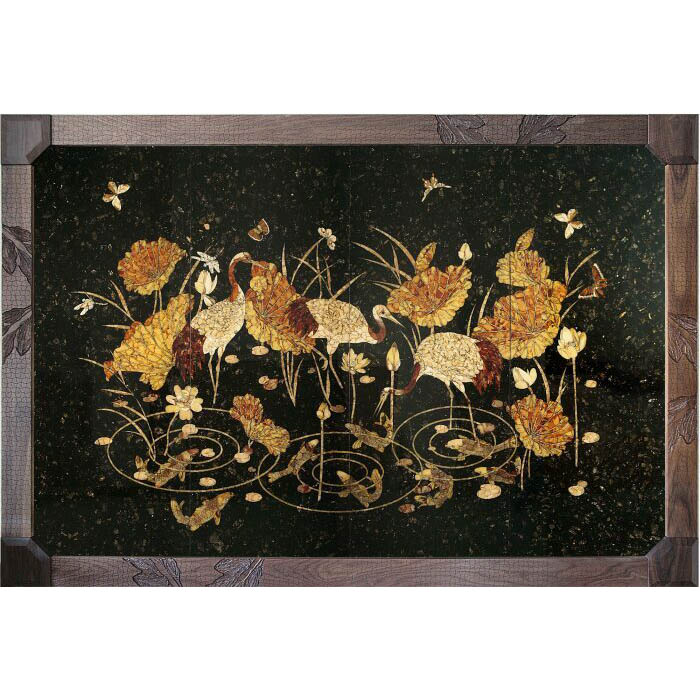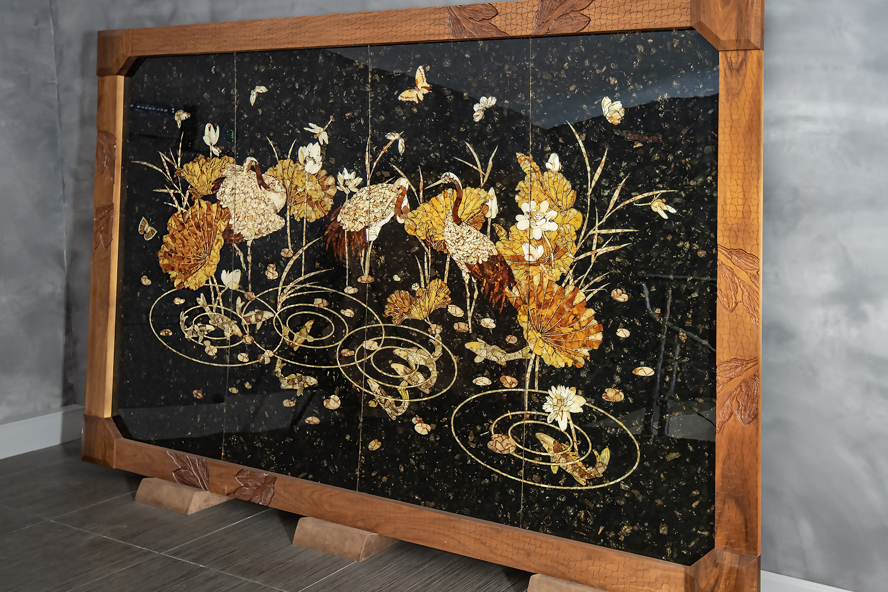 Основой панно служит благородный орех, глубокий темный оттенок которого создает идеальный фон для янтарных журавлей и водных лотосов. Каждая фигура выполнена вручную, мастерски воссоздавая каждую деталь. Нежные белые лепестки лотоса плавно переплетаются с янтарными элементами, словно светящимися изнутри. В центральной части композиции изображены журавли — символы долголетия и удачи, — изящно перемещающиеся над водной гладью и создающие ощущение спокойствия и возвышенности.