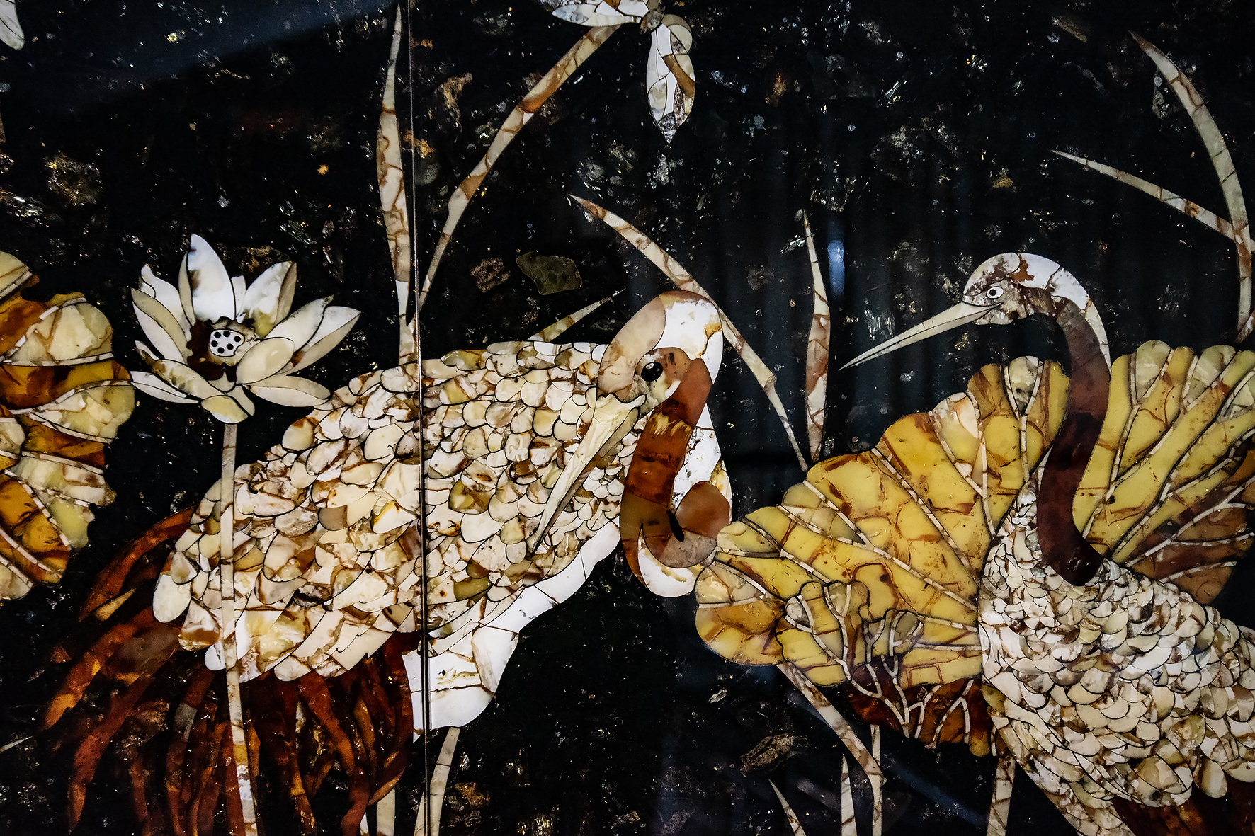 Каждая птица выполнена в технике "Ковровская мозаика" и собрана из кусочков янтаря разной цветовой палитры. Этот подход не только усиливает объем и глубину изображения, но и делает каждую деталь неповторимой. Янтарь — от черного до белого "королевского", который состовляет не более 2% от общей доли добываемого сырья — оживляет фигуры и придает им необыкновенное сияние. Особое внимание стоит обратить на тончайшие линии и переходы цветов, где каждый кусочек янтаря буквально "дышит" историей своей природы.