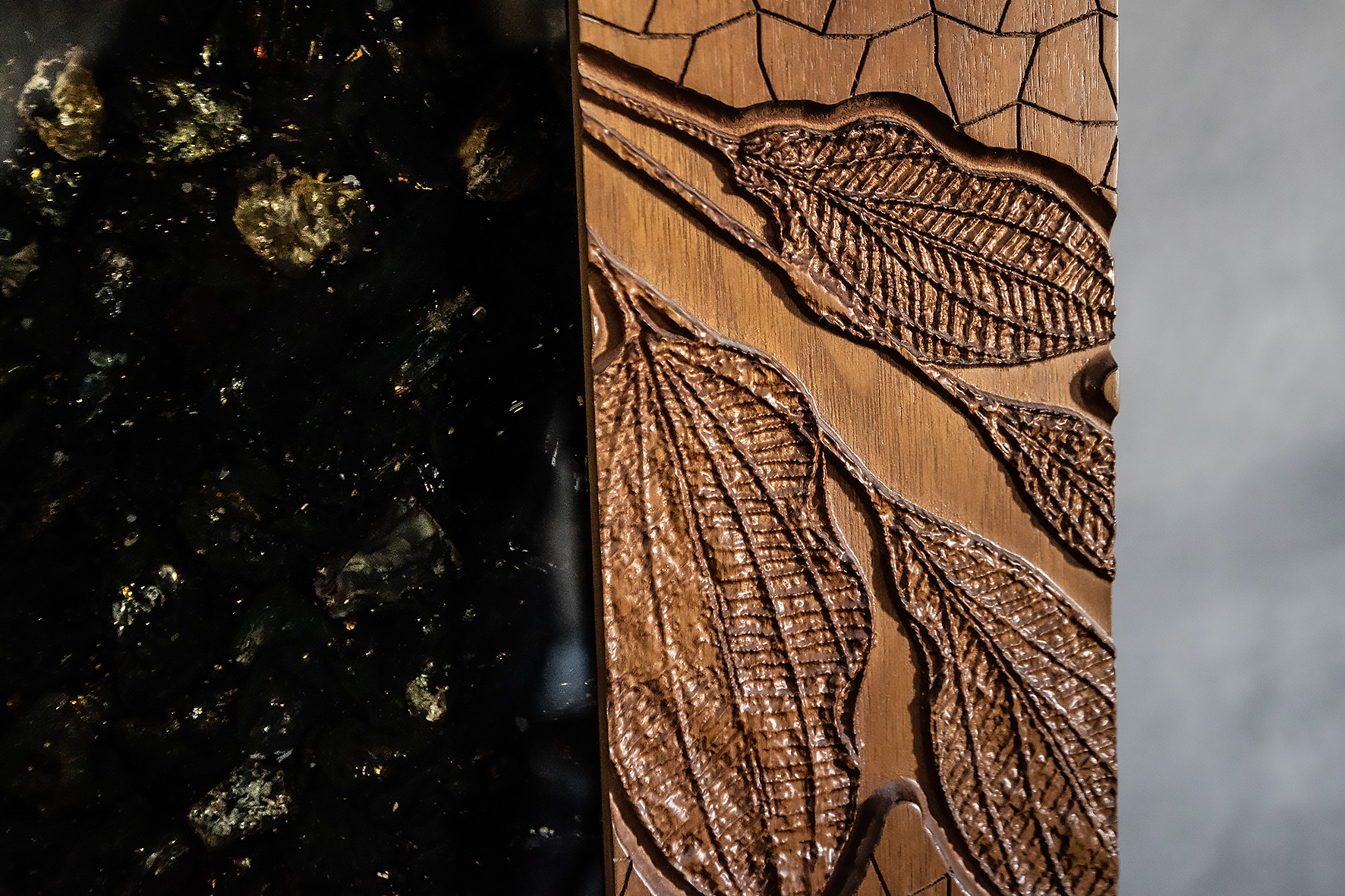 Резные деревянные элементы на раме добавляют финальный штрих в общую композицию. Листья, вырезанные с филигранной точностью, продолжают общую тему панно, подчеркивая его связь с миром природы и одновременно выделяя его художественную ценность. Эти резные детали переходят от фона к центру, создавая ощущение бесконечного движения — как будто журавли продолжают свое перемещение в бесконечность.