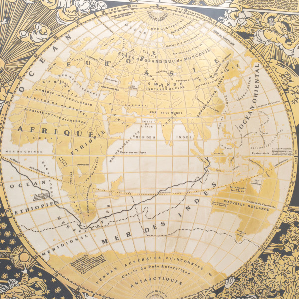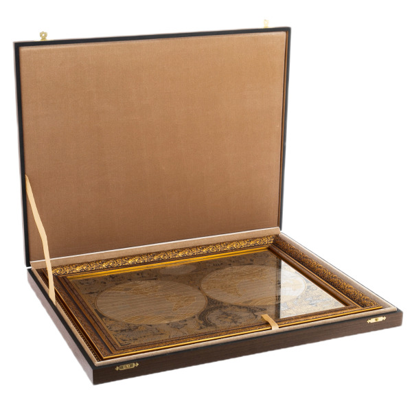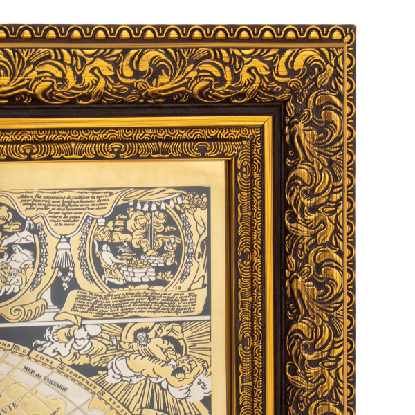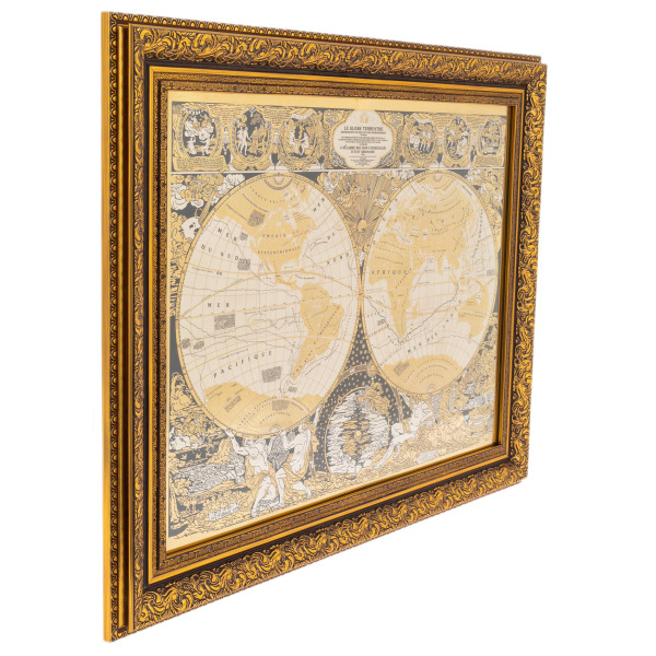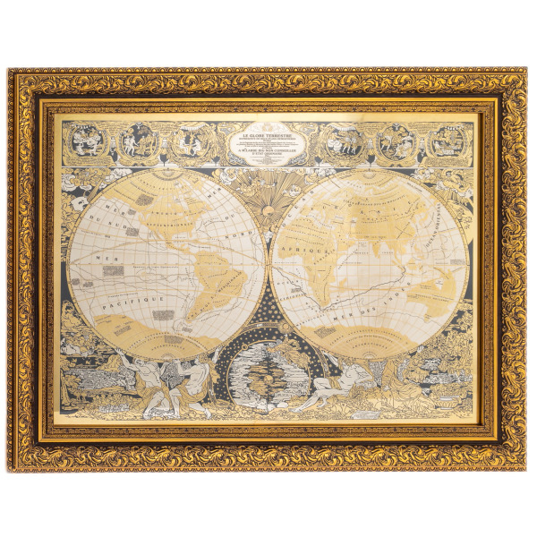 Панно «Карта мира» — это не просто географическая схема, а художественная интерпретация мировой карты в духе антикварных гравюр, воплощённая в благородном металле. Основа композиции — две гравированные полусферы, представляющие Восточное и Западное полушария, выполненные с филигранной точностью. Каждая линия, каждая надпись воспроизводит эстетику старинных карт XVII века — на французском языке, с аллегорическими фигурами и мифологическими мотивами. Окружение карты украшено сценами, символизирующими стихии, цивилизации и движение времени. Панно обрамлено изысканным резным киотом с глубокой позолотой, подчеркивающей исторический характер композиции.