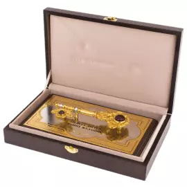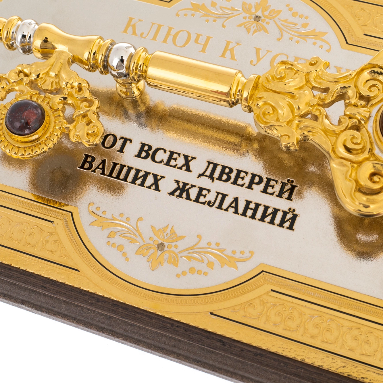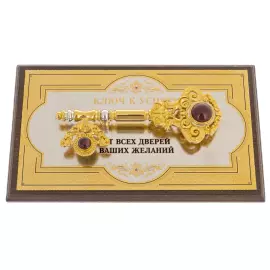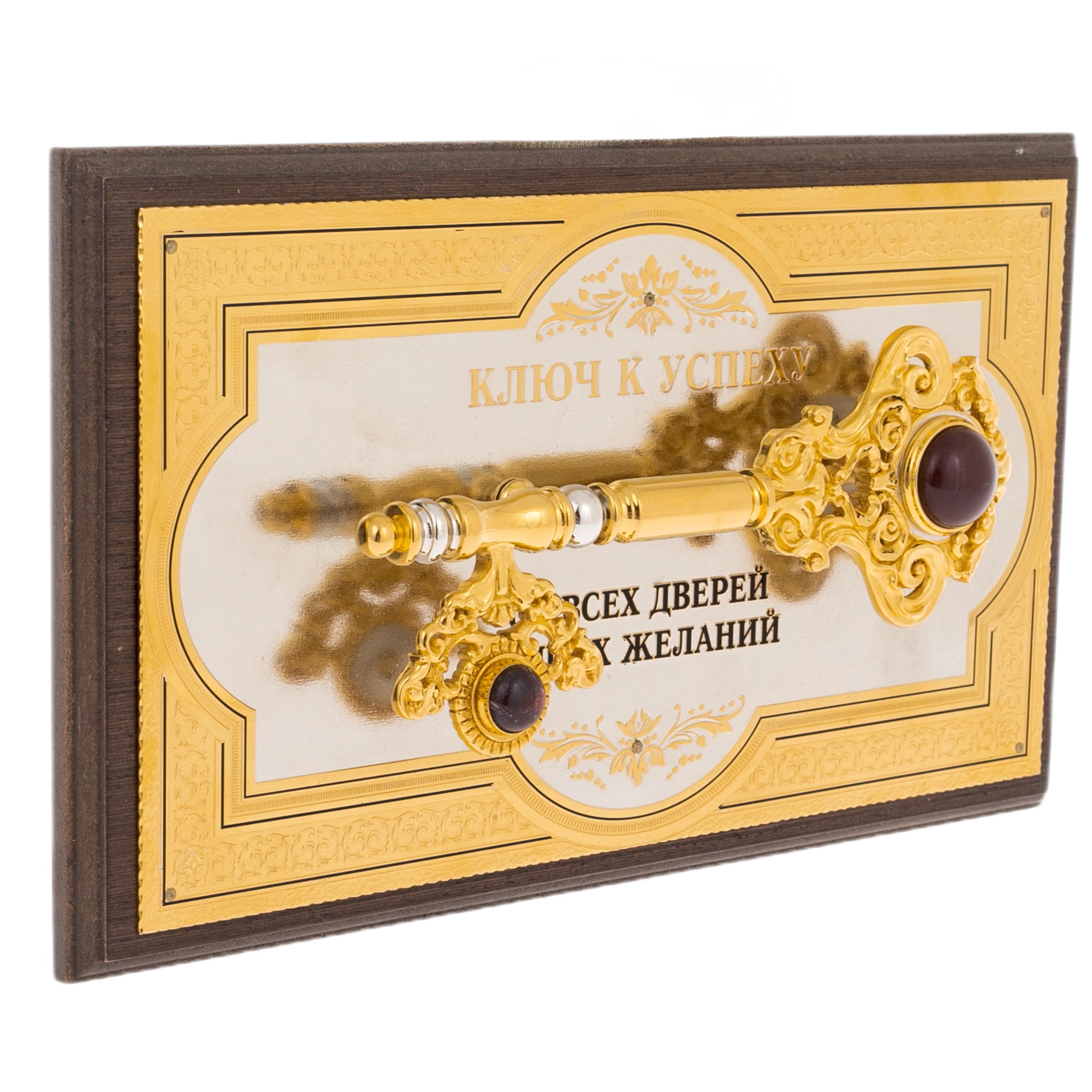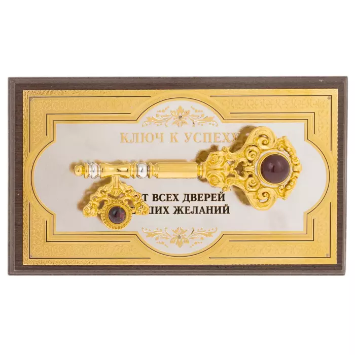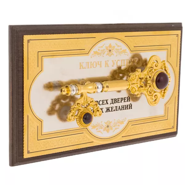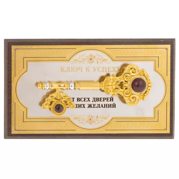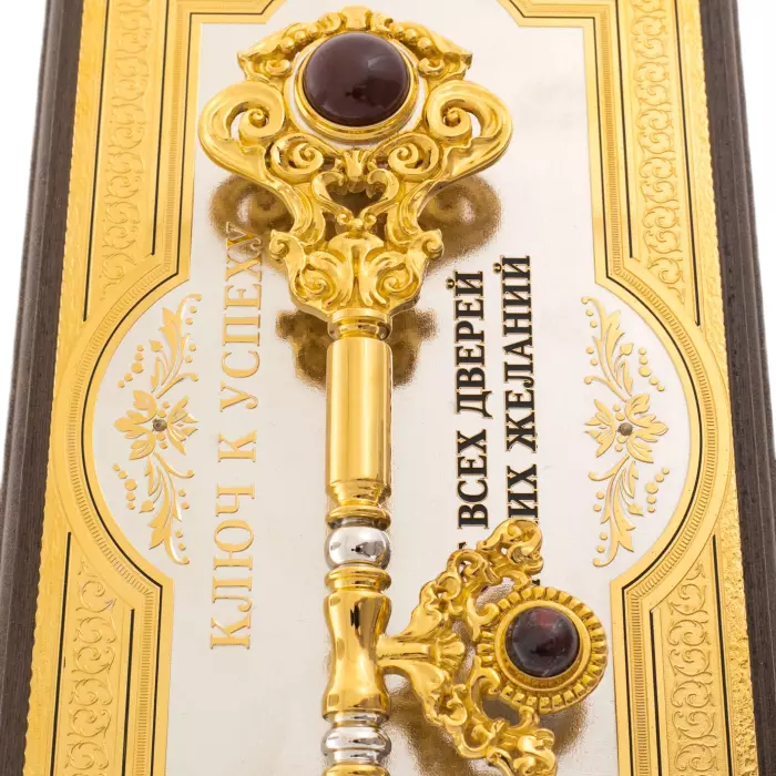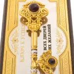 Панно «Ключ от всех желаний» — символический арт-объект, в котором декоративное мастерство соединено с выразительной идеей. Центральным элементом композиции выступает изящно выполненный ключ, размещённый на декоративной основе с благородным золотым фоном и обрамлением из натурального дерева. Орнаментальная рамка с тонкой гравировкой усиливает ощущение торжественности, а вставки с насыщенными камнями придают изделию глубину и акцентируют внимание на ключевых деталях. Надпись, интегрированная в композицию, формирует завершённый образ, раскрывая смысл подарка.