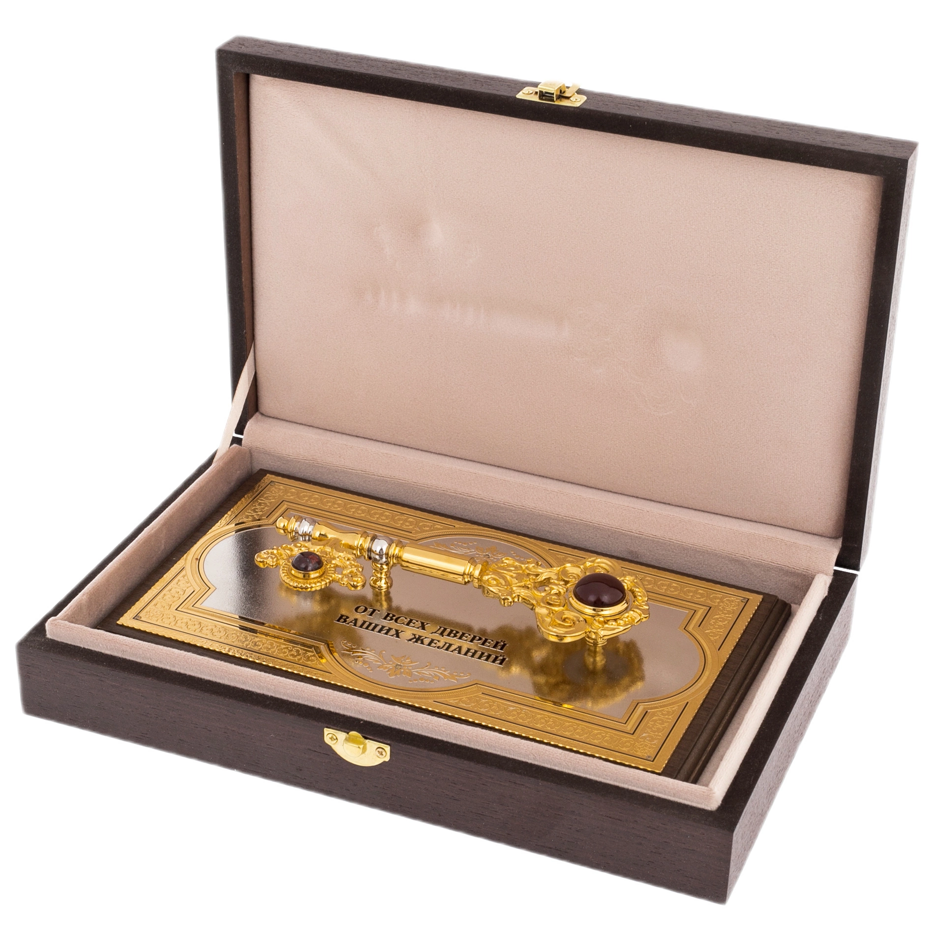 Изделие создано в традициях златоустовской художественной обработки металла — с характерной тщательной проработкой орнамента, использованием гравировки и позолоты. Поверхности украшены растительными и классическими мотивами, выполненными с высокой точностью, благодаря чему рисунок выглядит объёмным и живым. Контраст гладких и матированных участков усиливает игру света, подчёркивая рельеф и создавая ощущение глубины. Каждая деталь, от формы ключа до декоративных вставок, продумана и доведена до безупречного исполнения.