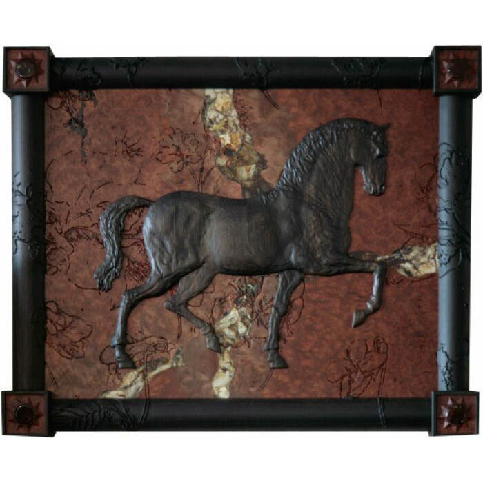Использование различных пород драгоценного дерева создает уникальный фон, на котором каждая ветвь и каждый узор рассказывают собственную историю. Янтарь добавляет света и теплоты, его мягкое сияние словно призвано подчеркнуть благородство и мощь изображенного коня.