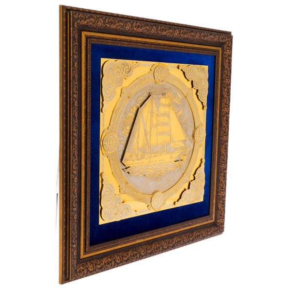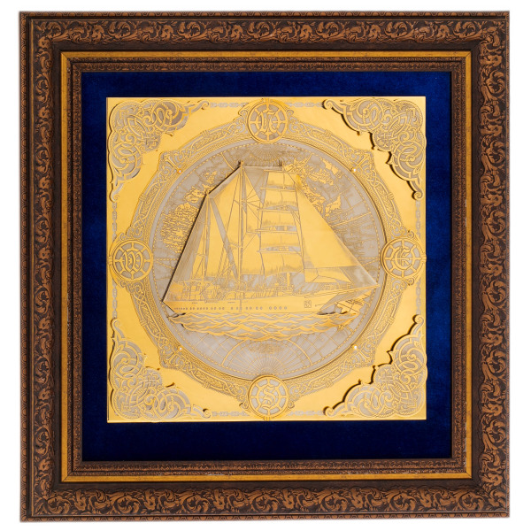 Корабль — это не просто средство передвижения, а знак уверенности и готовности покорять новые горизонты. Гравировка, выполненная в традиционной златоустовской технике, отличается ювелирной точностью и филигранностью. Сочетание золота и никеля придает панно благородный блеск, создавая впечатление роскоши и изысканности. Картина заключена в раму с богатой орнаментацией, которая подчеркивает её уникальность и делает произведение достойным внимания тех, кто привык окружать себя предметами исключительного качества.