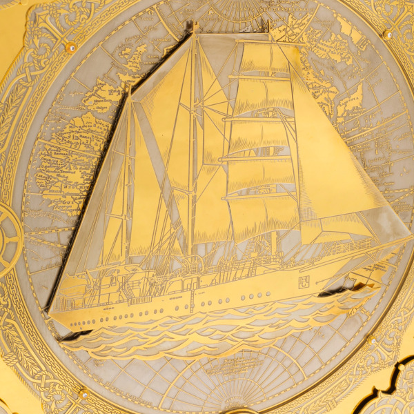 Златоустовская техника гравировки, в которой выполнено это панно, известна своей эксклюзивностью. Каждый штрих выполнен вручную с тщательной проработкой мельчайших деталей. Изображение корабля создано таким образом, что он словно выплывает из плоскости панно, добавляя картине глубину и объём. Тщательно продуманная композиция включает в себя не только изображение парусника, но и карты, что символизирует путешествия и открытия. Это делает это панно настоящим артефактом для ценителей искусства и истории.