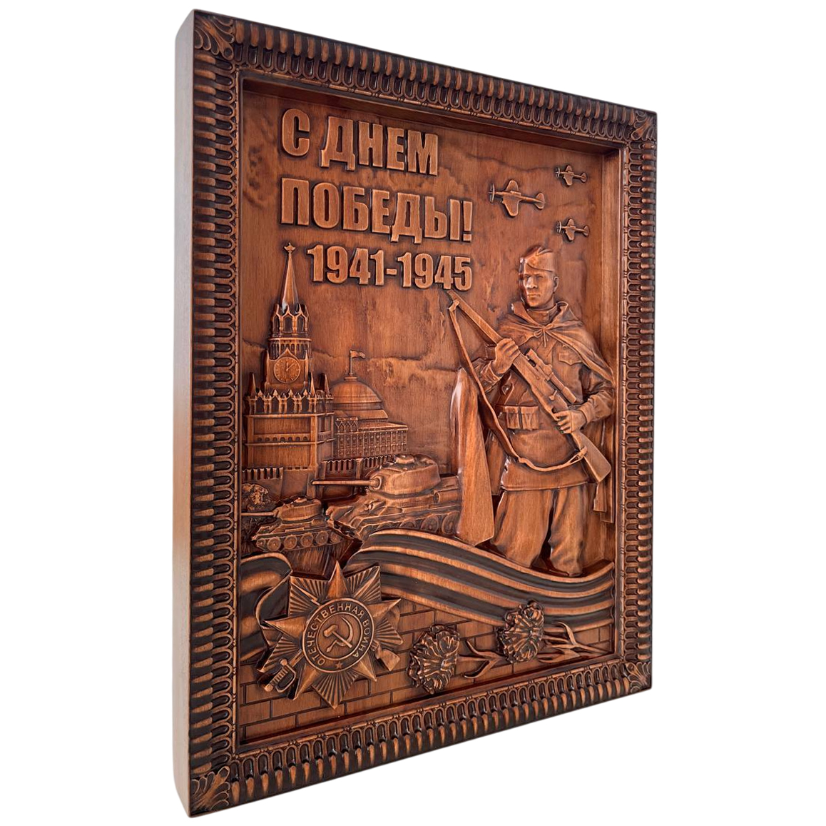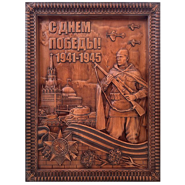 Резное панно "9 мая", выполненное из массива бука, — это выразительный символ памяти, мужества и благодарности. Каждая деталь на поверхности словно оживает в игре света и тени: солдат в шинели с винтовкой в руках, Кремль на фоне победного неба, военная техника и летящие самолёты — всё пронизано торжественностью и внутренней силой. На первом плане развевается Георгиевская лента, а у подножия композиции покоятся гвоздики — цветы памяти, которые несут к вечному огню миллионы людей.