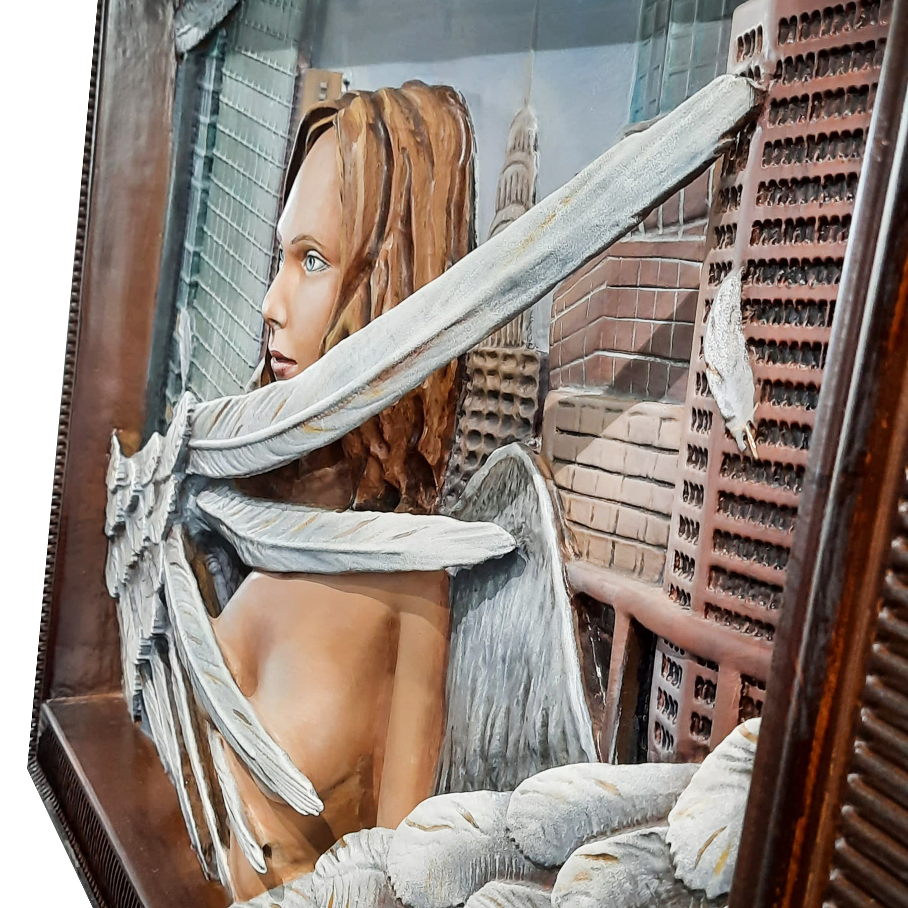 Каждая деталь этого панно выполнена с высокой степенью мастерства. Резьба по дереву передает тонкости перьев ангельских крыльев, добавляя динамику и ощущение движения. Контраст между мягкостью образа ангела и жёсткими линиями городской архитектуры создаёт впечатляющую визуальную глубину, подчёркивая уникальность композиции.