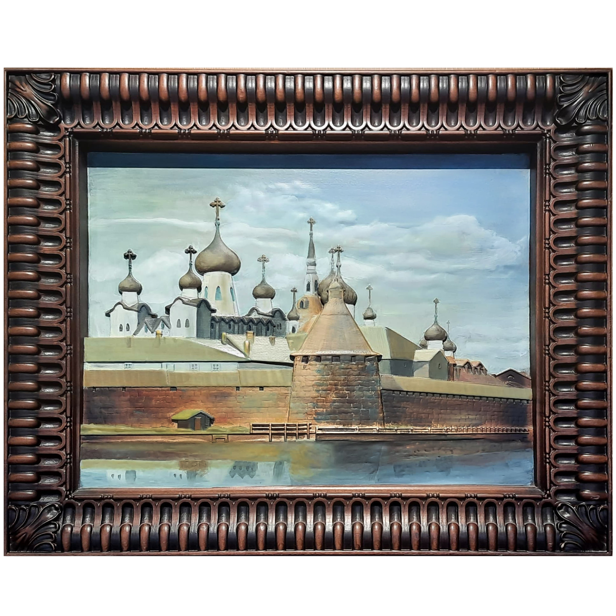 Панно резное "Соловецкий монастырь" — это выдающееся произведение искусства, запечатлевшее величественный архитектурный облик одного из самых значимых духовных центров России. На панно изображен Соловецкий монастырь, его массивные крепостные стены, охраняющие древние храмы с куполами, устремляющимися в небо. Каждый купол, каждая башня воспроизводят атмосферу древности и непреклонности монастыря, который столетиями был символом силы веры и духа.