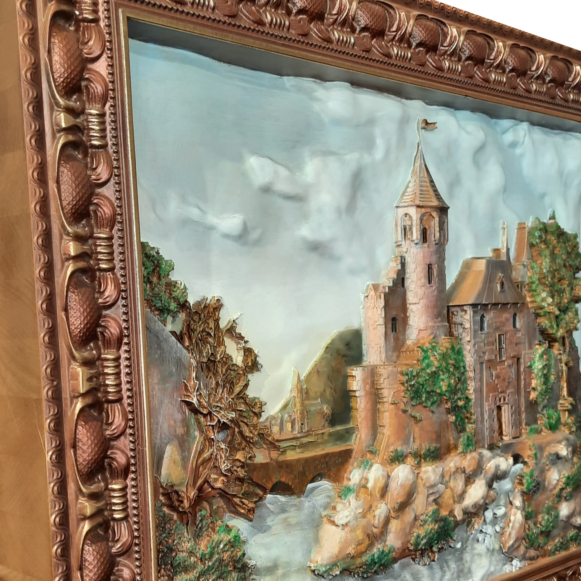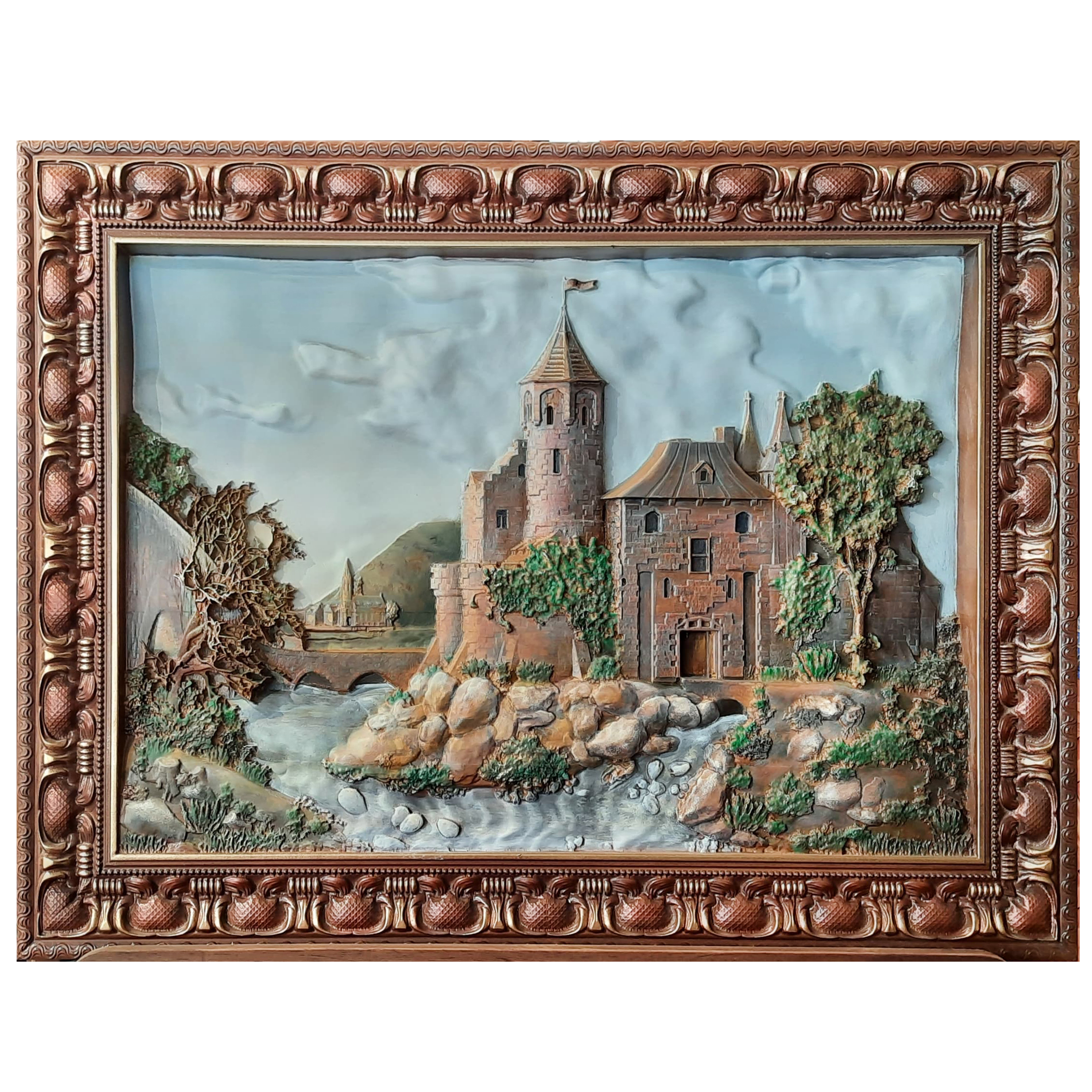 Резное панно "Замок с башней" — это настоящая поэма, высеченная в дереве, погружающая нас в атмосферу величественной старины и таинственных преданий. На этом барельефе предстаёт древний замок, величественно возвышающийся на берегу реки. Его крепостные стены, отполированные временем, говорят о могуществе и неприступности, а башня, словно хранитель древних тайн, устремляется к небесам, символизируя власть и силу.