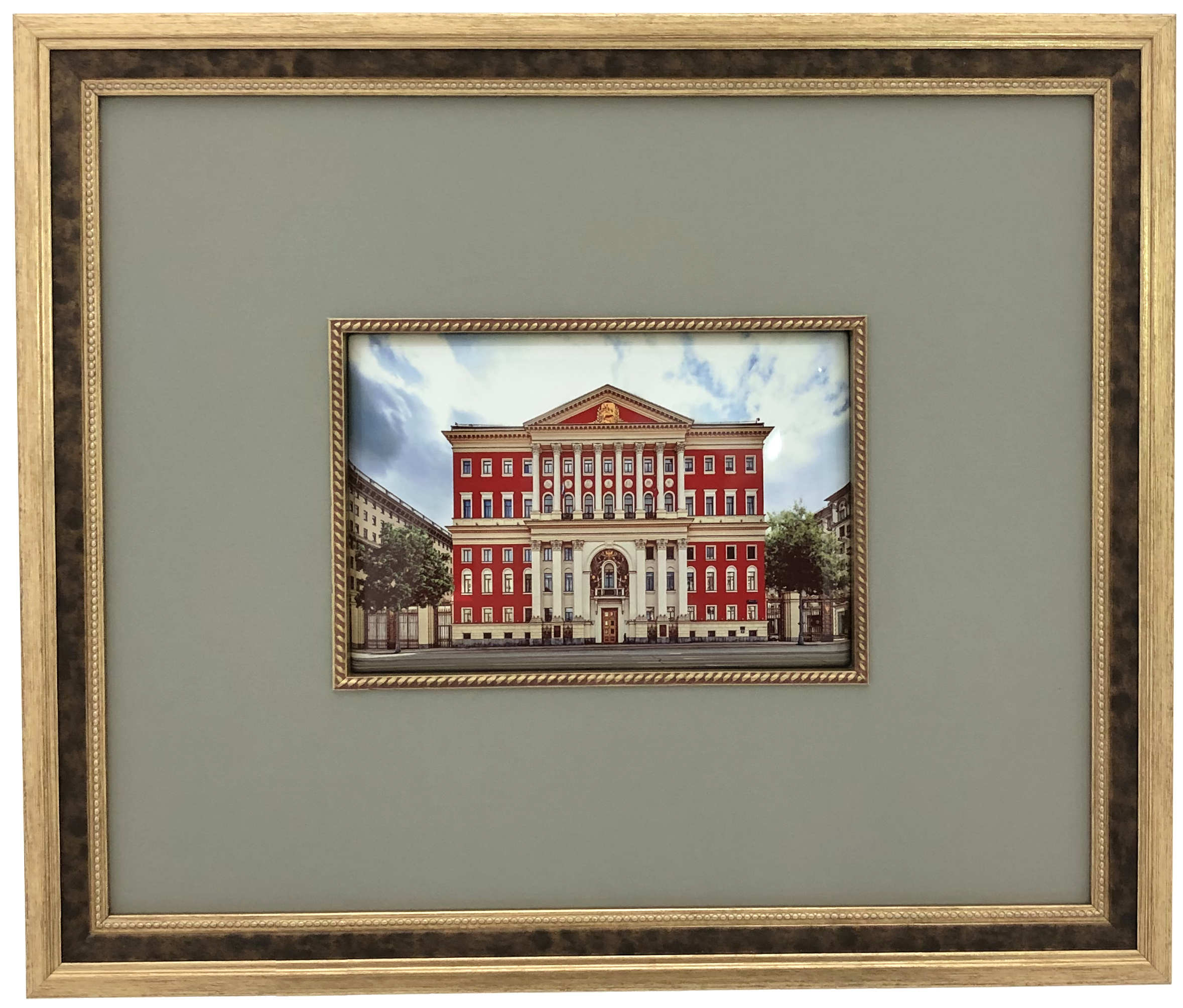 Материалы:металлическая пластина лимитированной серии с изображением Мэрии Москвы, глазурь, декоративный слип из натурального дерева, паспарту из дизайнерского картона, дизайнерский багет из натурального дерева с элементами классического декора, подрамник из натурального дерева, задник из оргалита и подвесного троса, закрепленного на винт-глазок из латуни золотого цвета.