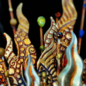 Изделие инкрустировано натуральными полудрагоценными камнями: амазонитом, розовым кварцем, хризоколлой, адуляром, розовым агатом, яшмой леопардовой, беломоритом, белым агатом, кахолонгом, родонитом и розовым турмалином. Каждый минерал обладает своей энергетикой и в сочетании с руническими связками многократно усиливает притягательную силу амулета, превращая его в мощный инструмент наполнения достатком и успехом. Покрытие золотой поталью придаёт работе торжественный блеск, а декоративная основа с акриловой заливкой, в которой заключены разбуженные зерна овса, символизирует плодородие и изобилие.