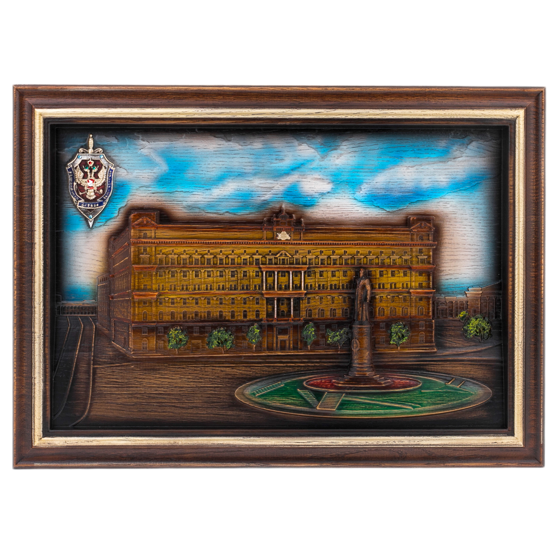 На панно изображено здание Лубянки — историческое сооружение, которое давно стало символом Москвы и одной из самых известных архитектурных достопримечательностей города. Массивное, внушительное здание с характерным фасадом и строгими линиями отражает дух времени, в котором оно было построено, и историю, связанную с важными событиями страны.