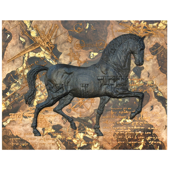 Тончайшая гравировка в виде чертежей, формул и зеркальных записей отсылает к рукописям Леонардо да Винчи — великого мыслителя, в чьих идеях пересекались наука и поэзия. Тёплые переливы древесины и мерцающие вкрапления янтаря создают иллюзию света, исходящего изнутри — как озарение, рождающееся в момент вдохновения.
