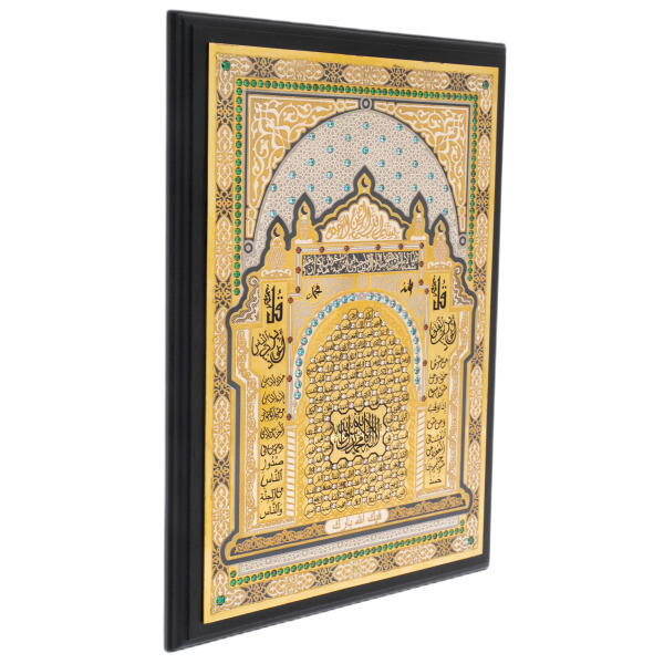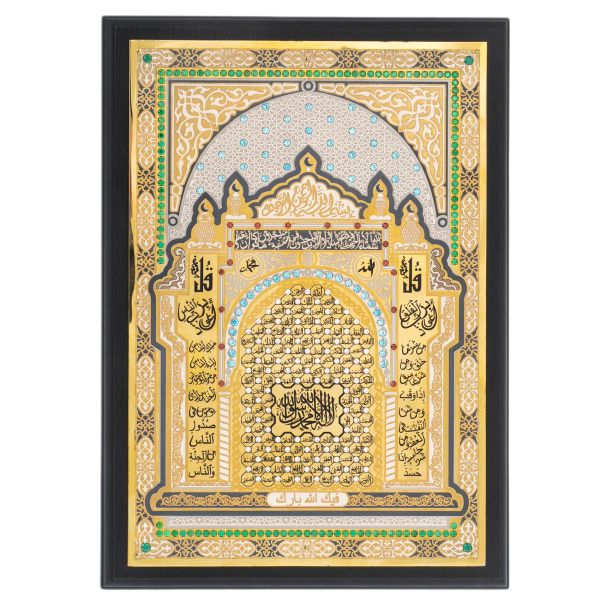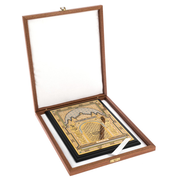Плакетка "99 имён Аллаха" — произведение, сочетающее священную арабскую каллиграфию, архитектурную гармонию и драгоценный блеск. Композиция оформлена в виде михраба — изящной арки, символизирующей направление молитвы, обрамлённой сложным орнаментом и украшенной сияющими вставками из фианитов. В центре — священные имена, выгравированные в золотом круге, каждое из которых отражает одно из совершенств Всевышнего. Симметрия, ритм и изящество линий создают образ, насыщенный не только эстетикой, но и глубокой духовной энергетикой. Плакетка заключена в строгую рамку чёрного цвета и бережно уложена в деревянный футляр, отделанный внутри мягким атласом.