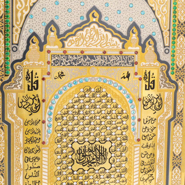 Техника исполнения — златоустовская гравировка, достигшая в этом произведении высшей степени ювелирного мастерства. Орнамент вытравлен вручную на металлической пластине, покрытой никелем и сусальным золотом, а затем с ювелирной точностью дополнен эмалью и вставками из фианитов. Цветовая палитра выверена до тона: благородные сочетания золотого, серебристого, чёрного и малахитово-зелёного подчеркивают величие текста и усиливают сакральный эффект. Пространство внутри арки наполнено мельчайшими деталями — каждая надпись, каждая грань фианита выверена и закреплена вручную. Композиция уравновешена, строится на принципах исламского искусства и вызывает ощущение внутреннего покоя.