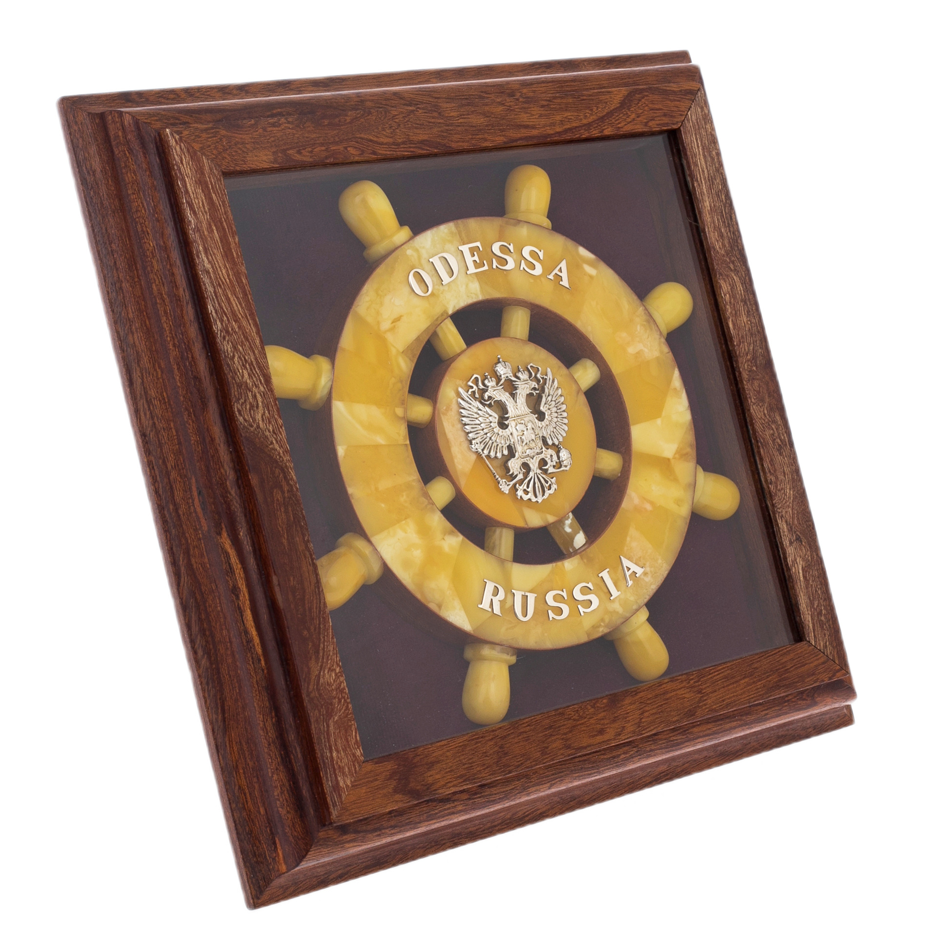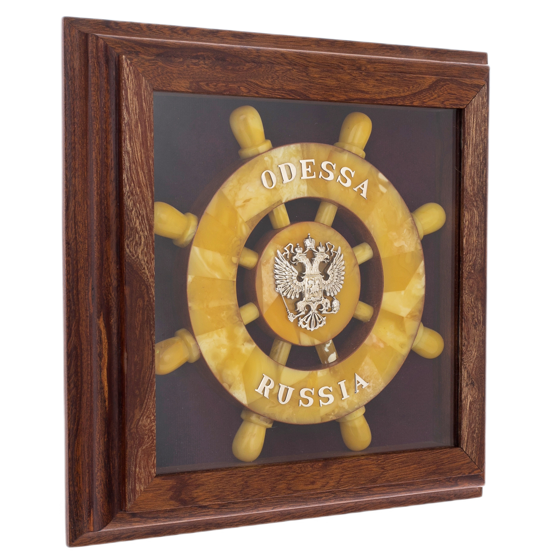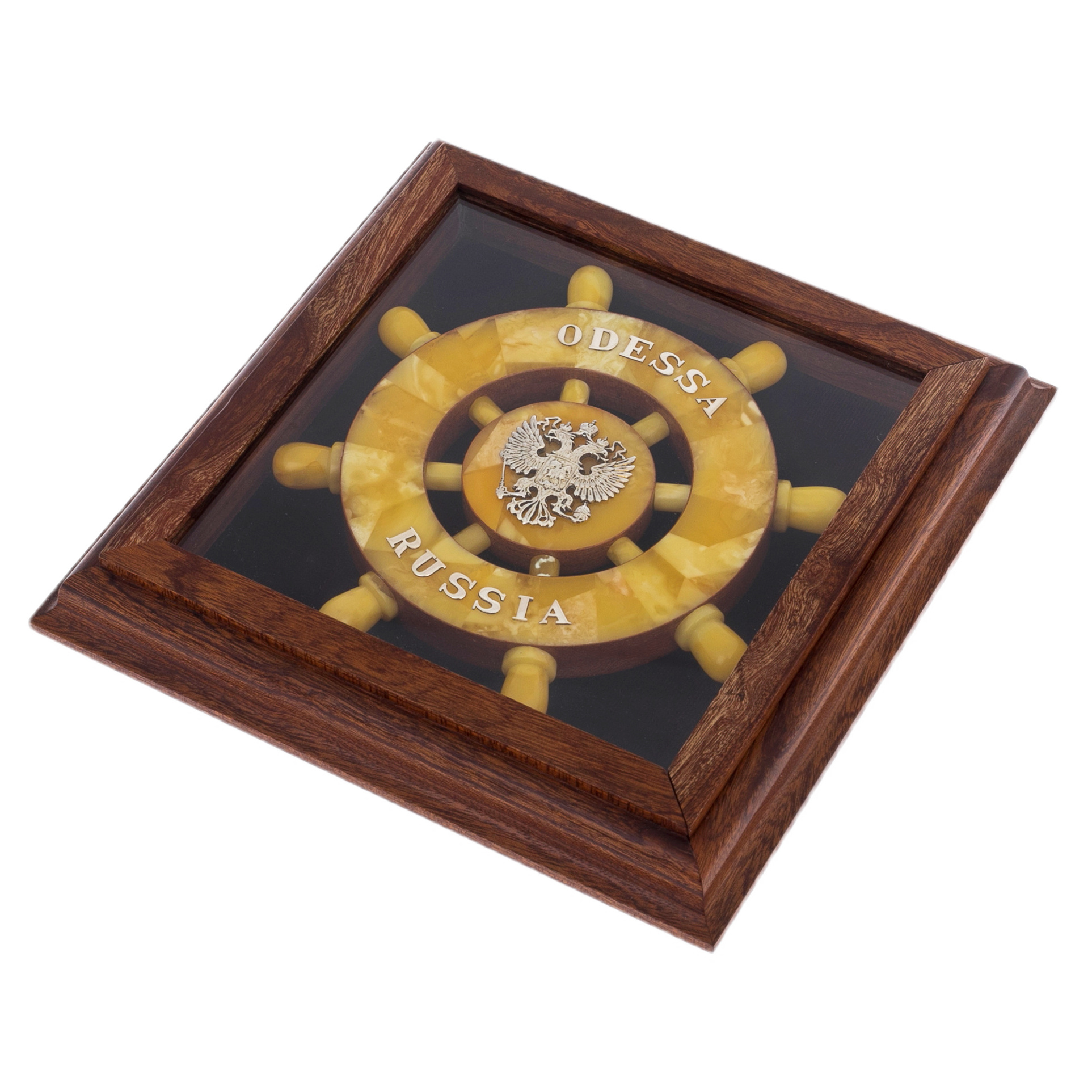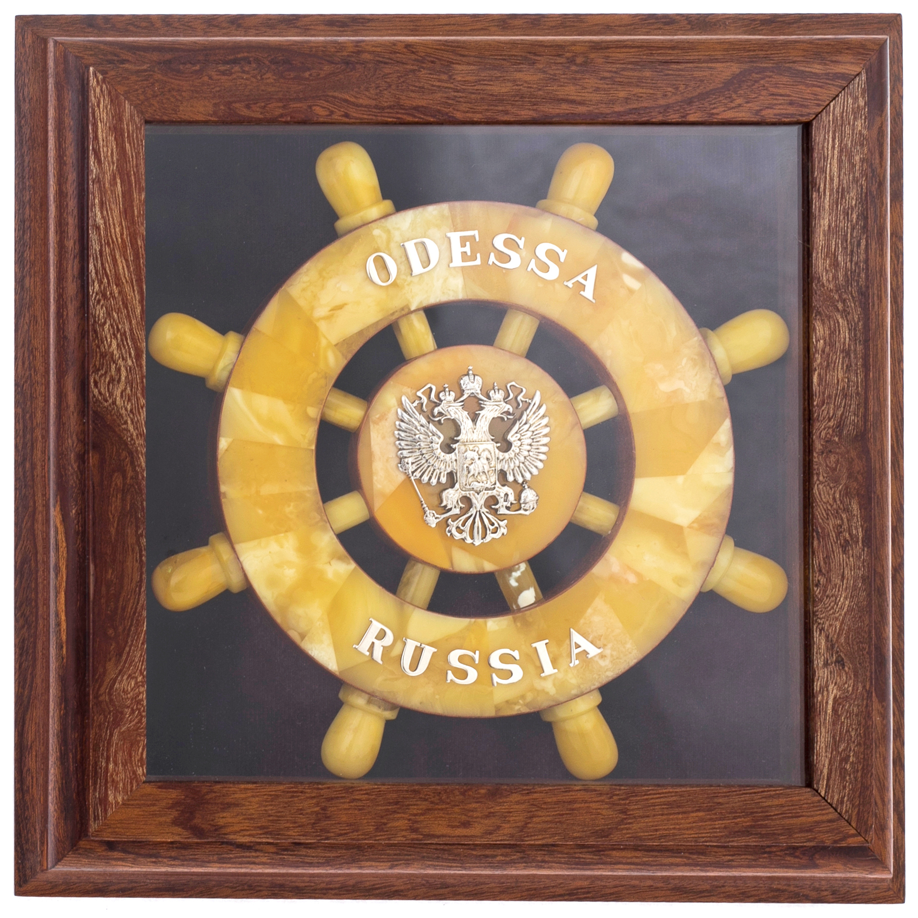 Штурвал из янтаря в обрамлении благородного дерева представляет собой редкий образец сувенирного искусства, в котором морская символика соединена с величием русской традиции. Полотно выполнено из крупных сегментов натурального янтаря медово-золотистых оттенков, излучающих мягкое внутреннее сияние. В центре композиции — изящный рельефный герб России, отлитый из серебра, подчёркивающий высокий статус и историческую значимость предмета. Надписи «Odessa» и «Russia» придают сувениру чёткую географическую и культурную привязку.