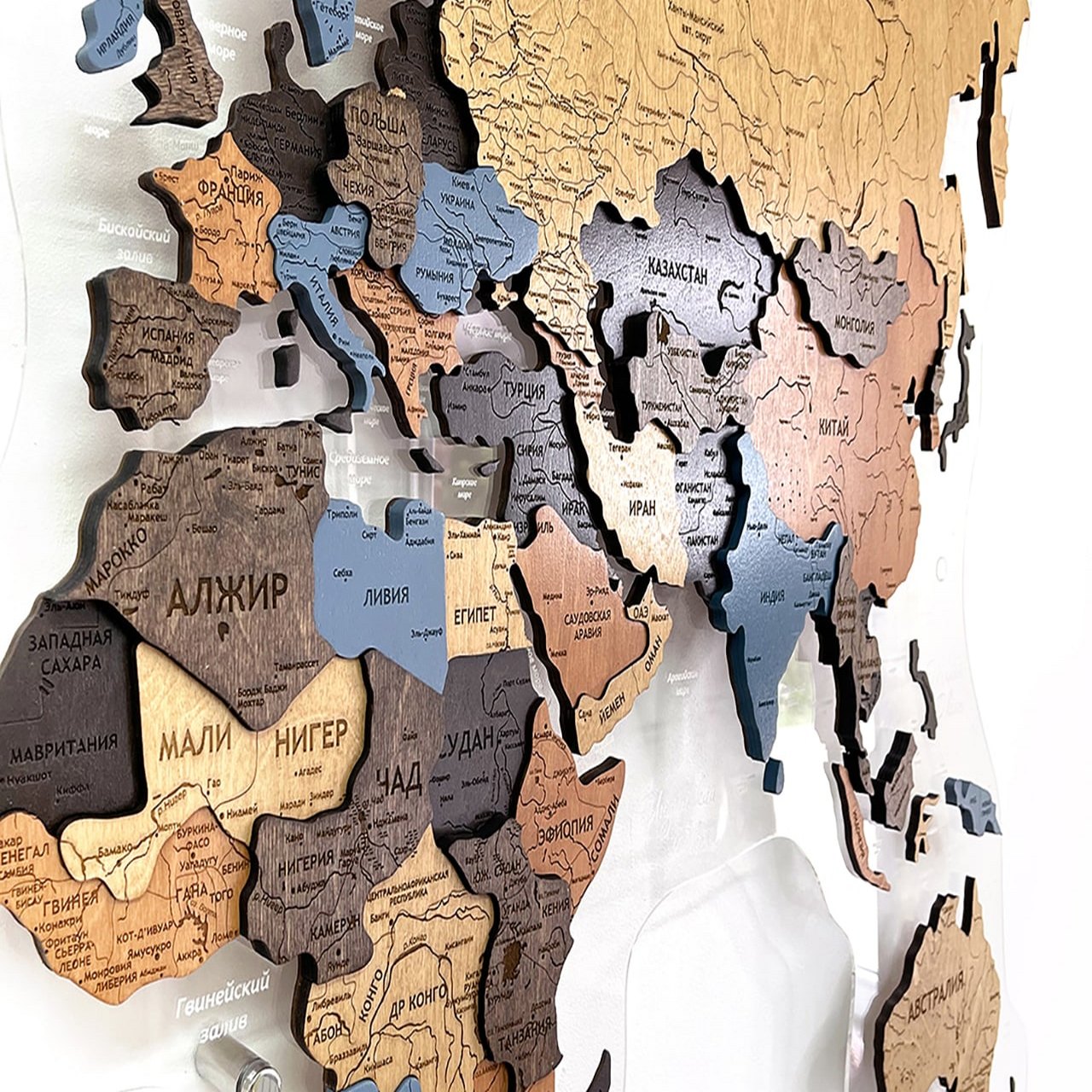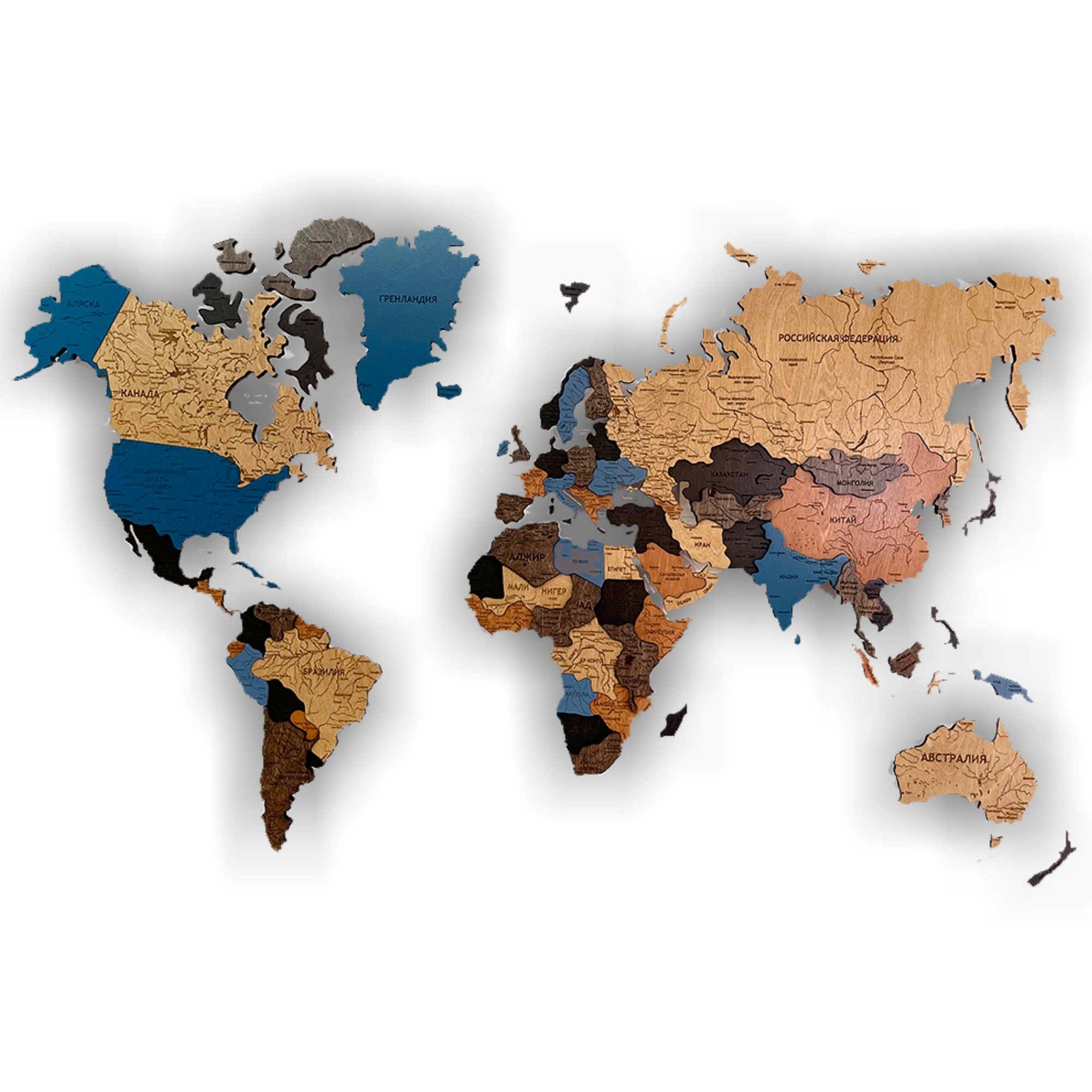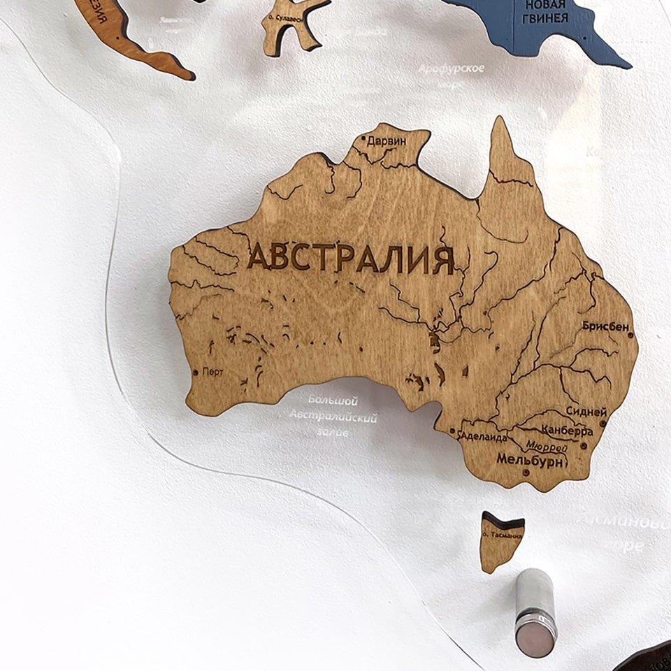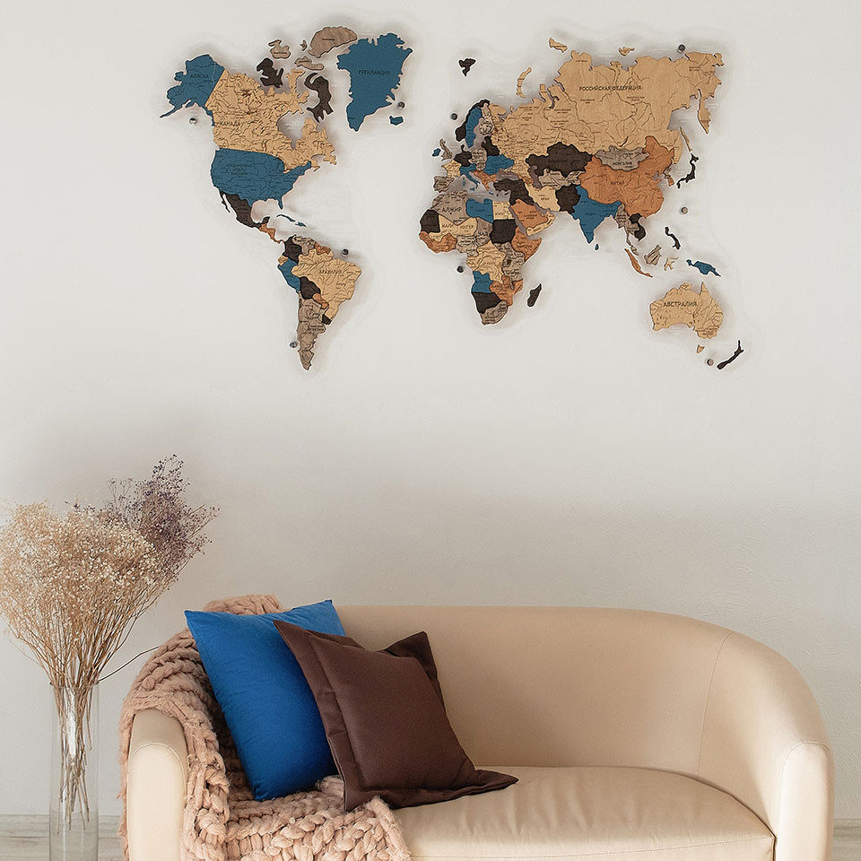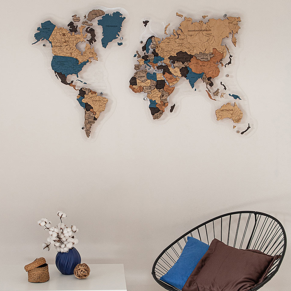 Карты мира 3D из ценных пород дерева поражают палитрой ярких оттенков. Каждая деталь карты шлифуется вручную и покрывается специальными гипоаллергенными красками. Границы и названия стран нанесены лазерной гравировкой. Контурный свет обеспечивается специальной подсветкой, которая управляется с ДУ пульта.