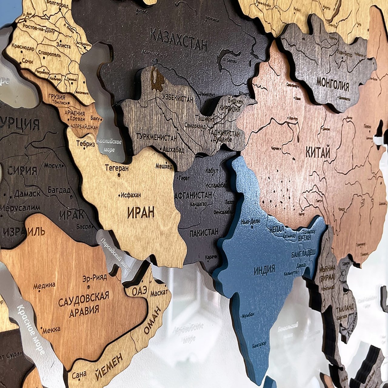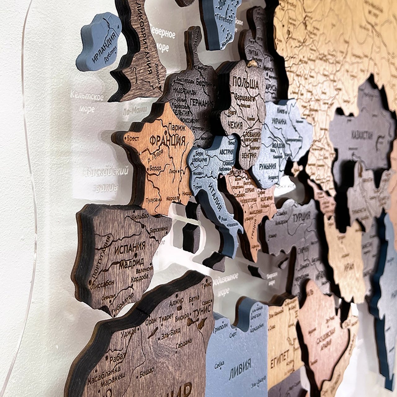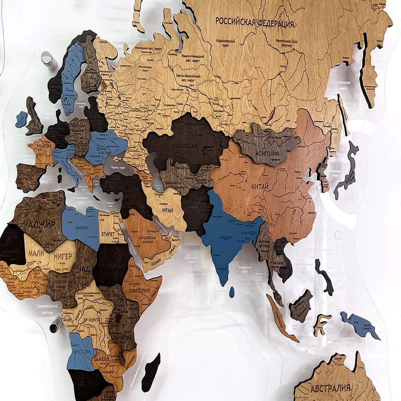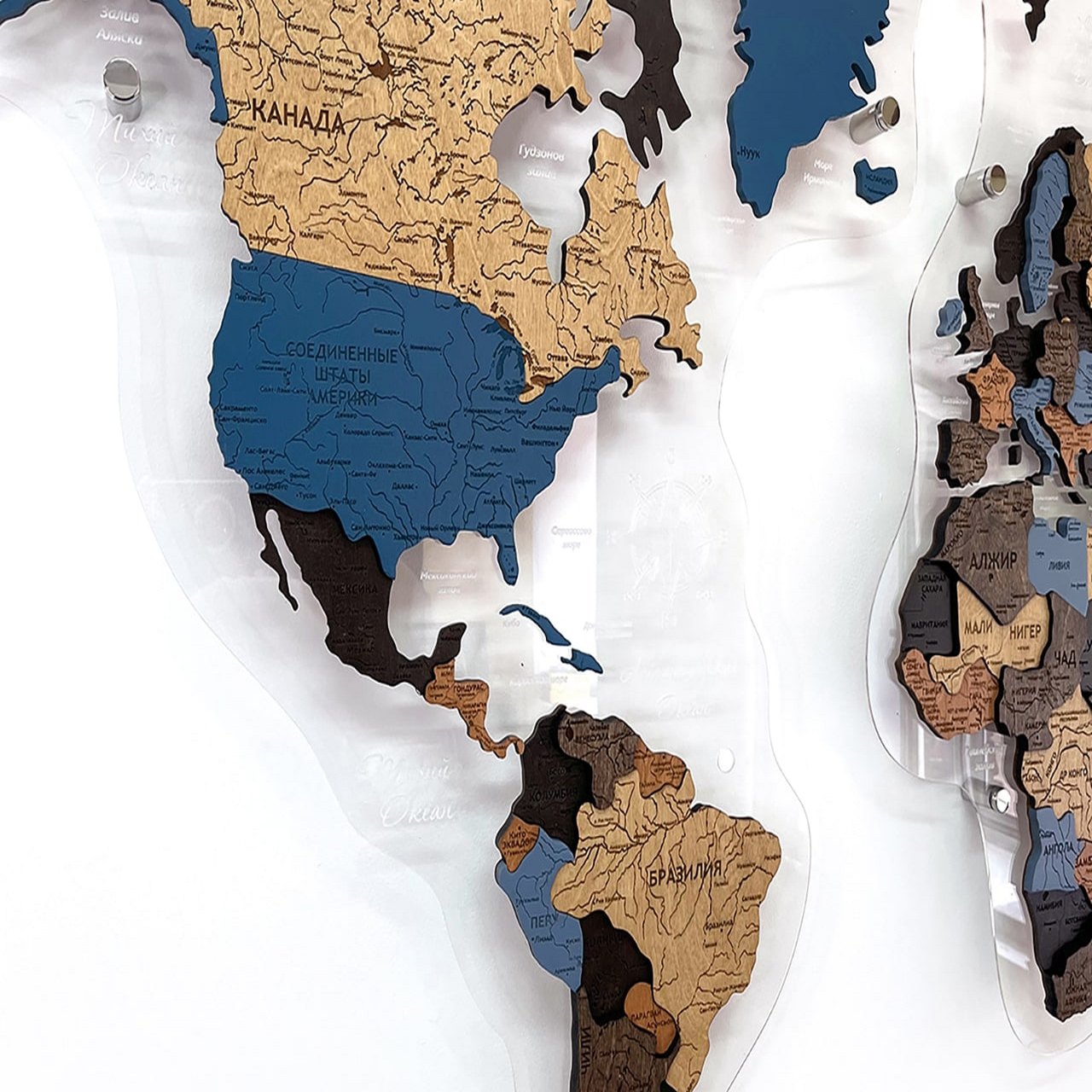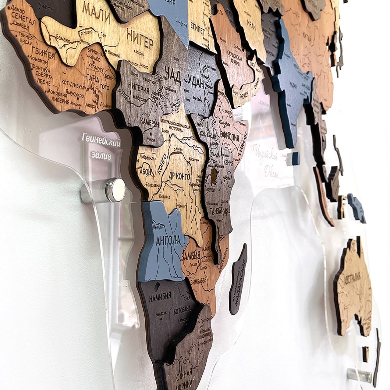 Карты мира 3D из ценных пород дерева поражают палитрой ярких оттенков. Каждая деталь карты шлифуется вручную и покрывается специальными гипоаллергенными красками. Границы и названия стран нанесены лазерной гравировкой. Контурный свет обеспечивается специальной подсветкой, которая управляется с ДУ пульта.