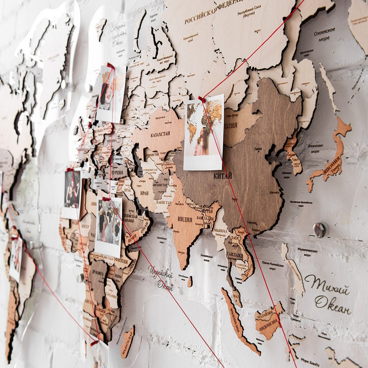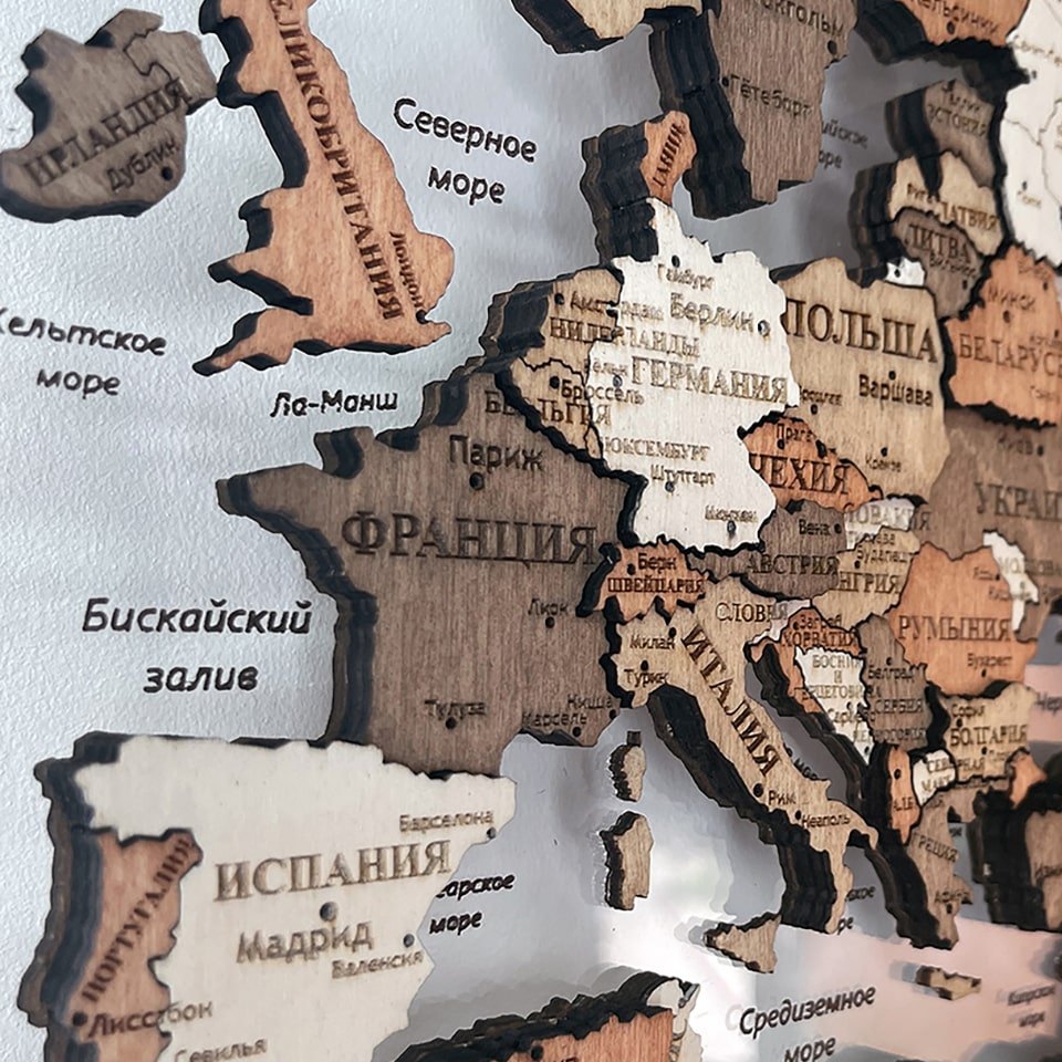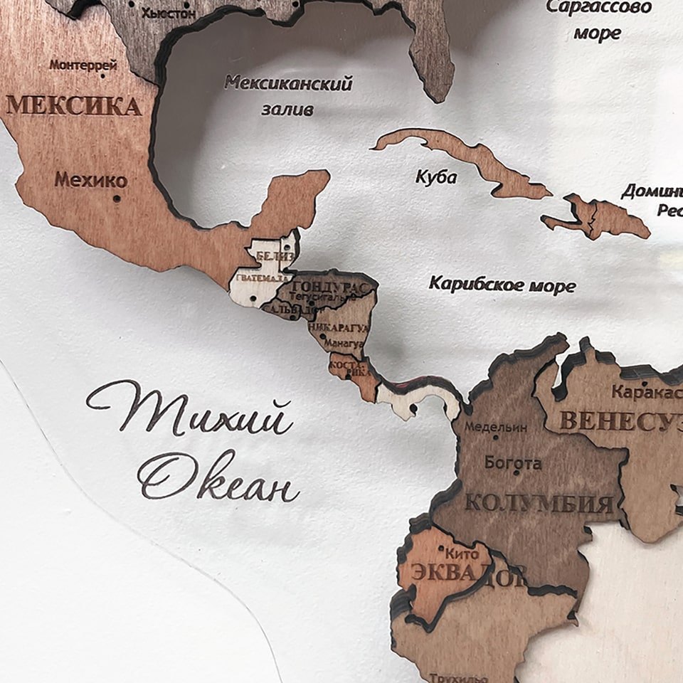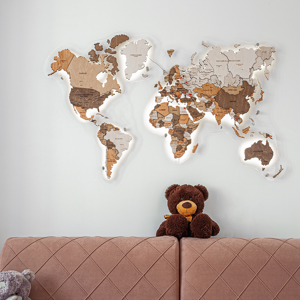 Карты мира 3D из ценных пород дерева поражают палитрой ярких оттенков. Каждая деталь карты шлифуется вручную и покрывается специальными гипоаллергенными красками. Границы и названия стран нанесены лазерной гравировкой. Контурный свет обеспечивается специальной подсветкой, которая управляется с ДУ пульта.