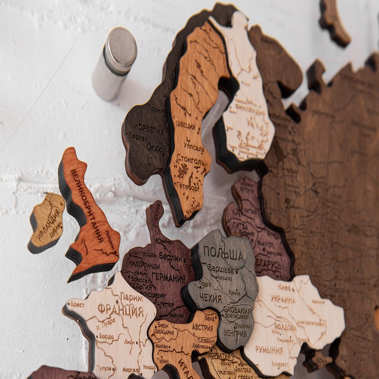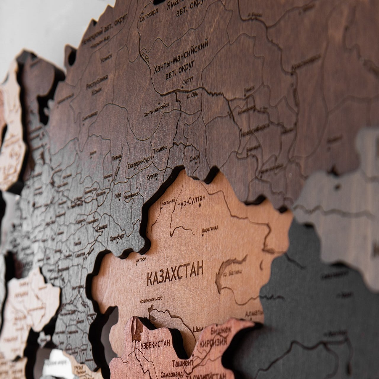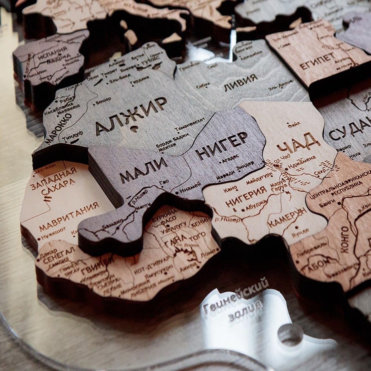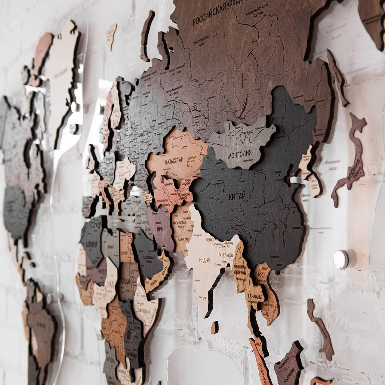 Карты мира 3D из ценных пород дерева поражают палитрой ярких оттенков. Каждая деталь карты шлифуется вручную и покрывается специальными гипоаллергенными красками. Границы и названия стран нанесены лазерной гравировкой. Контурный свет обеспечивается специальной подсветкой, которая управляется с ДУ пульта.