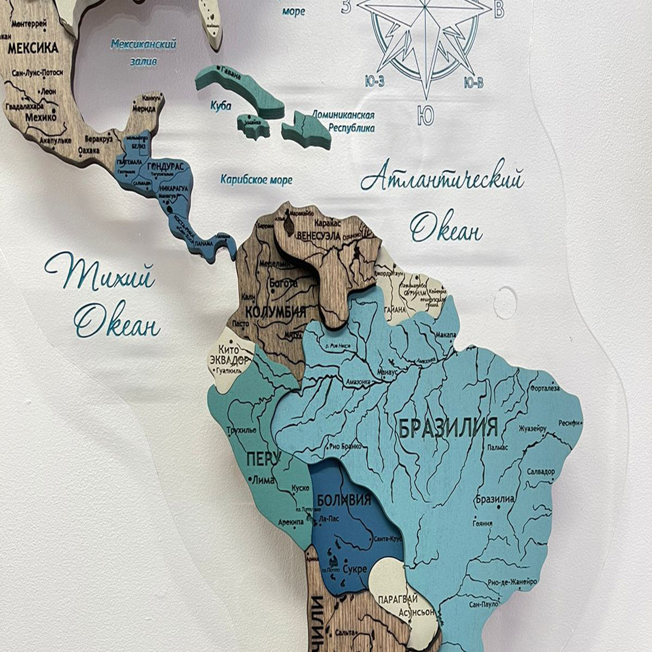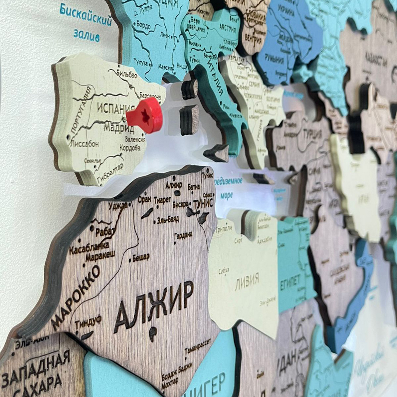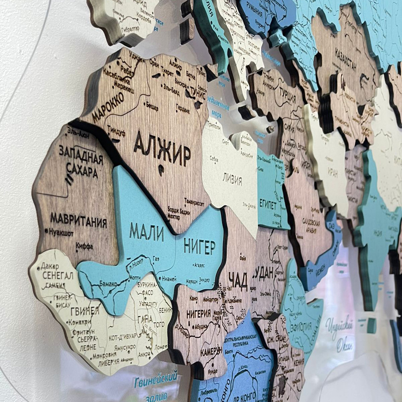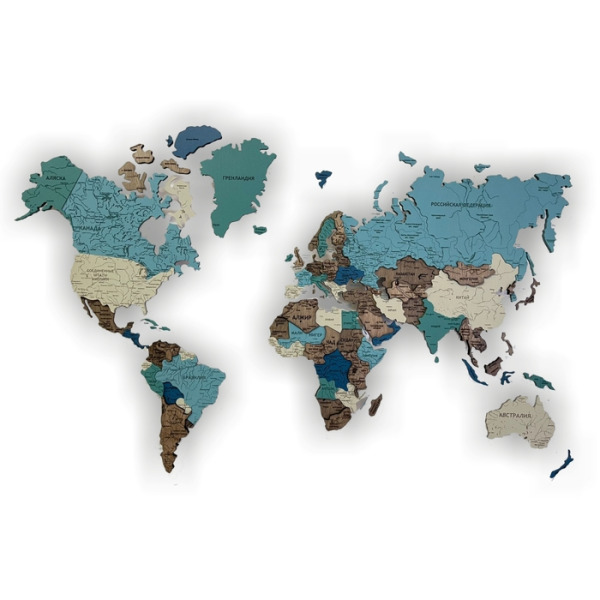Карты мира 3D из ценных пород дерева поражают палитрой ярких оттенков. Каждая деталь карты шлифуется вручную и покрывается специальными гипоаллергенными красками. Границы и названия стран нанесены лазерной гравировкой. Контурный свет обеспечивается специальной подсветкой, которая управляется с ДУ пульта.