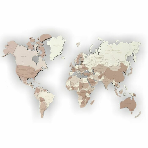 Карты мира 3D из ценных пород дерева поражают палитрой ярких оттенков. Каждая деталь карты шлифуется вручную и покрывается специальными гипоаллергенными красками. Границы и названия стран нанесены лазерной гравировкой. Контурный свет обеспечивается специальной подсветкой, которая управляется с ДУ пульта.
