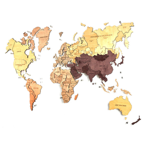 Карты мира 3D из ценных пород дерева поражают палитрой ярких оттенков. Каждая деталь карты шлифуется вручную и покрывается специальными гипоаллергенными красками. Границы и названия стран нанесены лазерной гравировкой. Контурный свет обеспечивается специальной подсветкой, которая управляется с ДУ пульта.