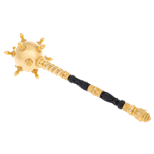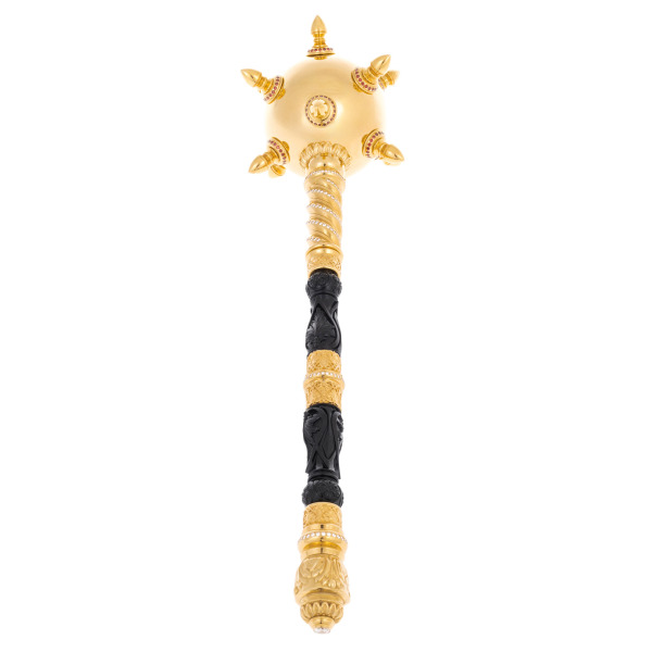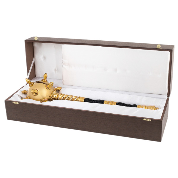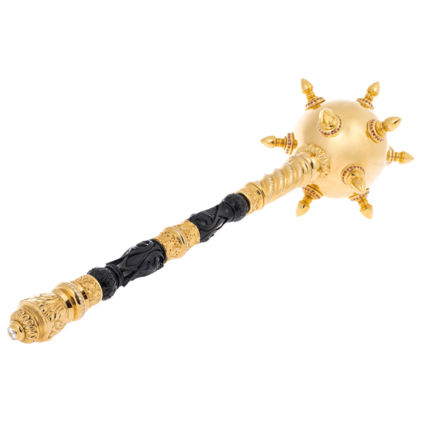 Это не просто булава — это воплощённая идея власти, могущества и исторического величия, овеянная ореолом традиции. Изящное соединение золочёного металла и чёрной резной вставки создаёт торжественную симфонию контрастов: блеск и тень, слава и сила, прошлое и настоящее. Каждый элемент — от пышных шипов до мельчайших узоров на ручке — отсылает к символике царской власти и полководческой доблести.