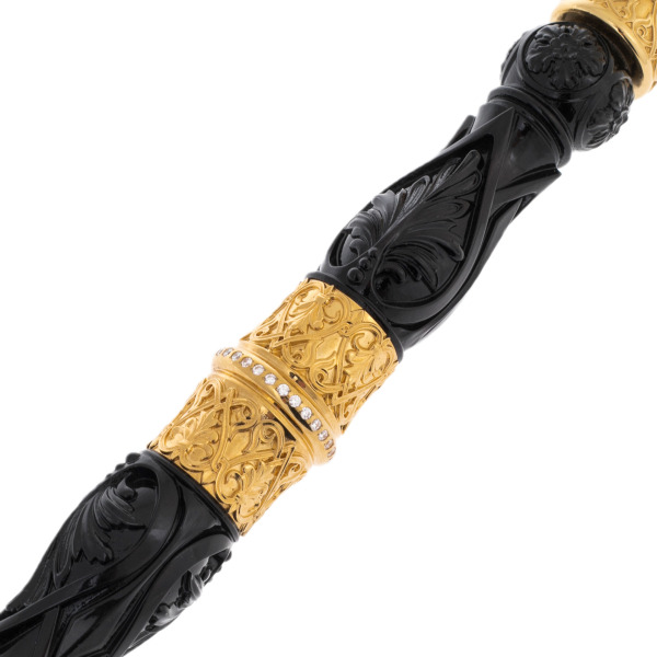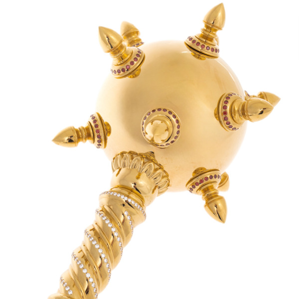 Рукоять декорирована эксклюзивным узором по золоту. Тончайший слой драгоценного металла нанесён на прочное и лёгкое латунное основание, украшен рисунком и выгравирован иглой и резцом. Благодаря технике травления узор стал объёмным, с чередованием матовых и глянцевых фрагментов. Для удобства середина рукояти выполнена из натурального ореха. Навершие булава дополнена позолоченными шипами. Каждый венчает тёмный фианит, который придаёт оружию изысканность и блеск.