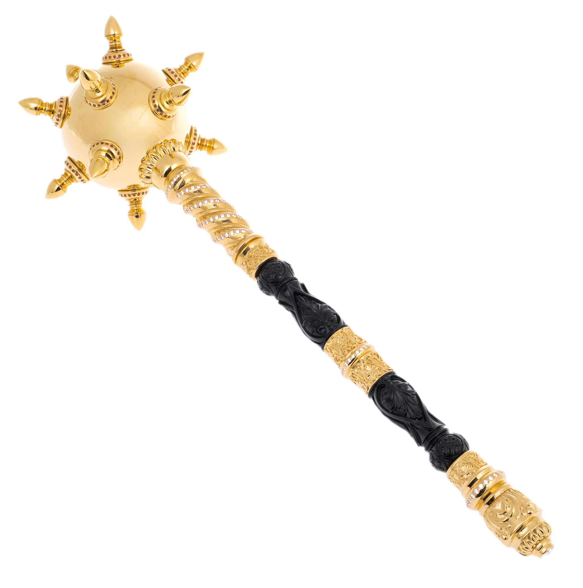 Сувенирная булава из Златоуста — символ власти, оформленный в образе, достойном парадного зала. Массивный боевой шар с золотым покрытием украшен восемью зубцами-арканами, обрамлёнными рубиновыми вставками. Отделка выполнена с ювелирной точностью, каждая деталь отточена до блеска, каждая грань подчеркивает статус и силу. Рукоять — скульптурная композиция из чёрного дерева, дополненная латунными вставками с гравировкой, обильно украшенная кристаллами и сложным орнаментом. Этот предмет не является оружием — он утверждает могущество, не прибегая к насилию.