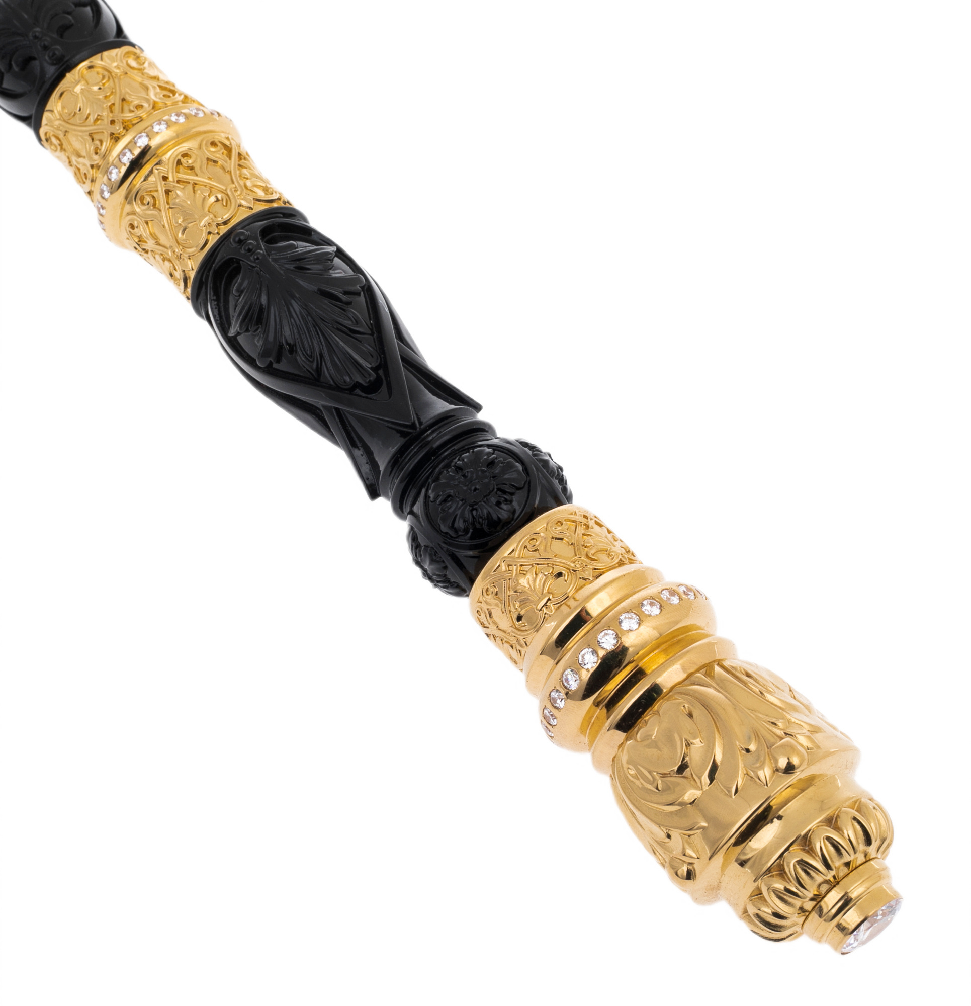 Техника изготовления вобрала в себя лучшие традиции златоустовской школы: глубокая гравировка, золочение, чернение, камнерезное искусство. Контраст блестящего золота и матовой фактуры дерева создаёт впечатление артефакта из музея власти — реликвии, соединяющей исторический вес и современное мастерство. Внимание к каждой детали — от витой ручки до миниатюрных шипов — подчёркивает уникальность исполнения и индивидуальность изделия, создавая не предмет интерьера, а выражение статуса.